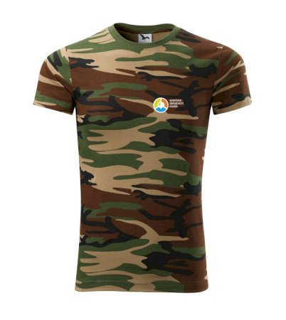 Tričko střední gramáže v barvách camouflage. Střih s bočními švy. Lem průkrčníku ze žebrového úpletu s přídavkem 5 % elastanu. Vnitřní část zadního průkrčníku začištěna páskou v barvě camouflage.