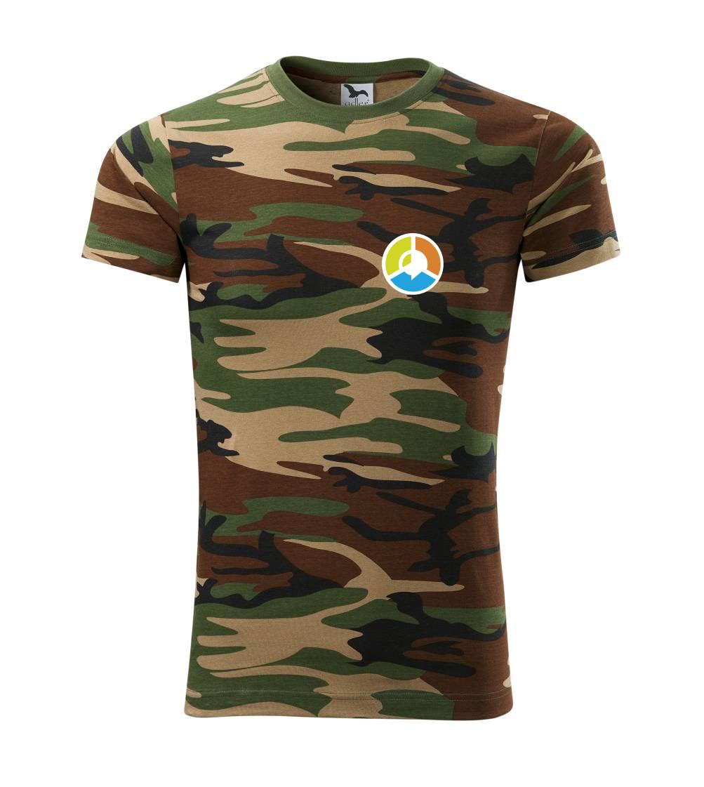 Tričko střední gramáže v barvách camouflage. Střih s bočními švy. Lem průkrčníku ze žebrového úpletu s přídavkem 5 % elastanu. Vnitřní část zadního průkrčníku začištěna páskou v barvě camouflage.