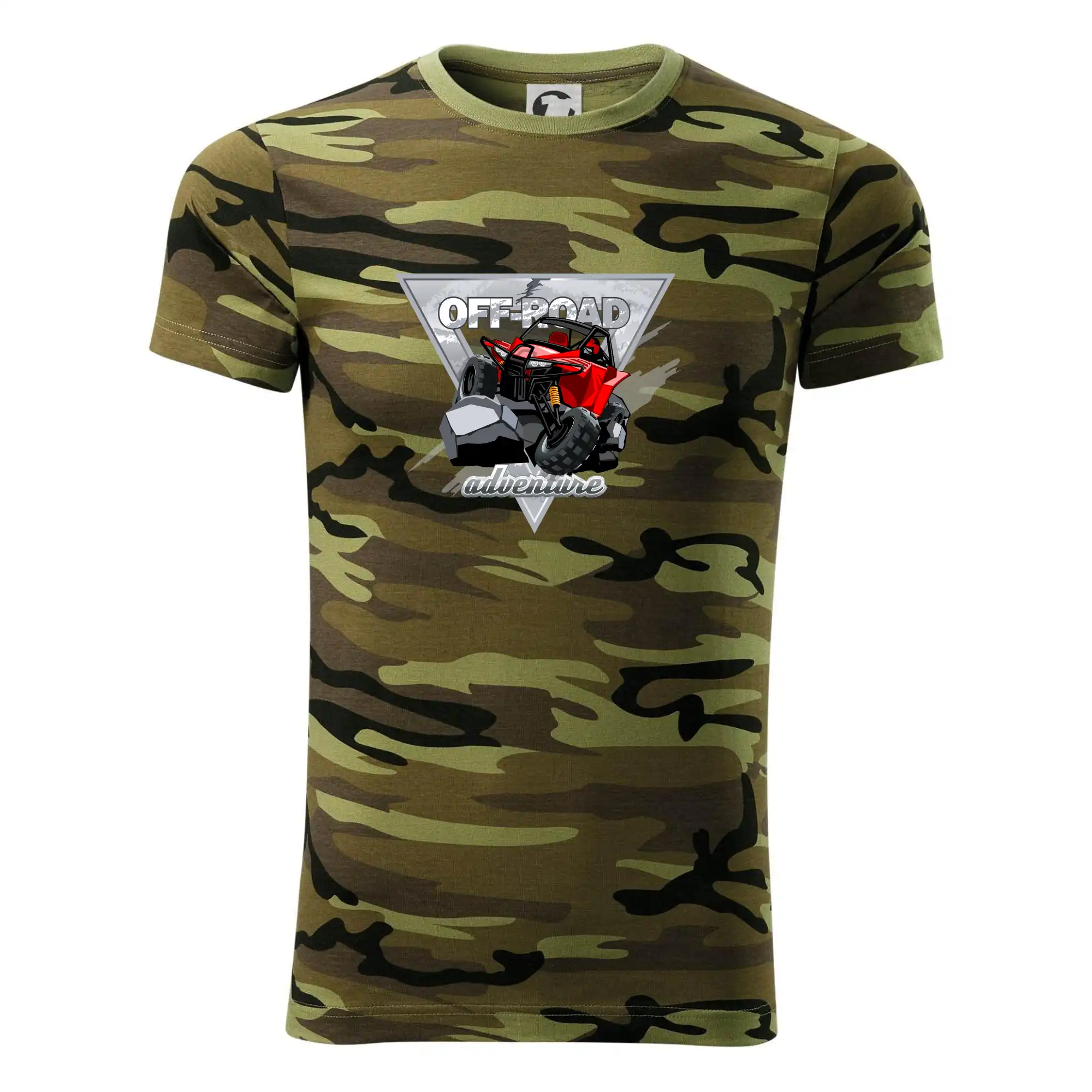 Tričko střední gramáže v barvách camouflage. Střih s bočními švy. Lem průkrčníku ze žebrového úpletu s přídavkem 5 % elastanu. Vnitřní část zadního průkrčníku začištěna páskou v barvě camouflage.