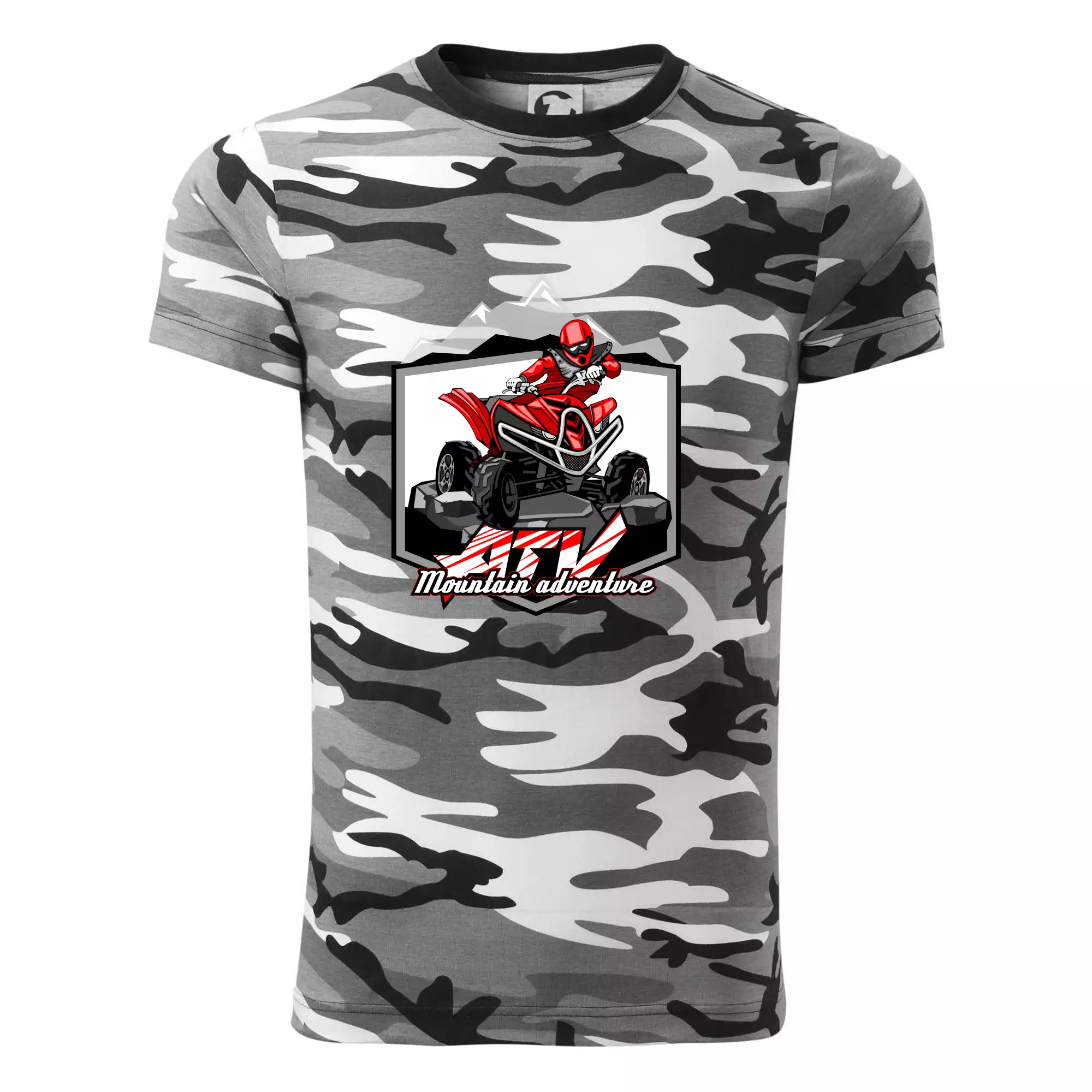 Tričko střední gramáže v barvách camouflage. Střih s bočními švy. Lem průkrčníku ze žebrového úpletu s přídavkem 5 % elastanu. Vnitřní část zadního průkrčníku začištěna páskou v barvě camouflage.