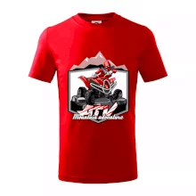 Triko pro motoristy, na kterém je červená čtyřkolka ATV a v pozadí hory. Motoristické triko kde je off road čtyřkolka musí mít doma každý motorista. Triko se čtyřkolkou je vhodný dárek pro motoristu, který má rád adrenalin. Čtyřkolka na triku je jako živá, prostě parádní auto.