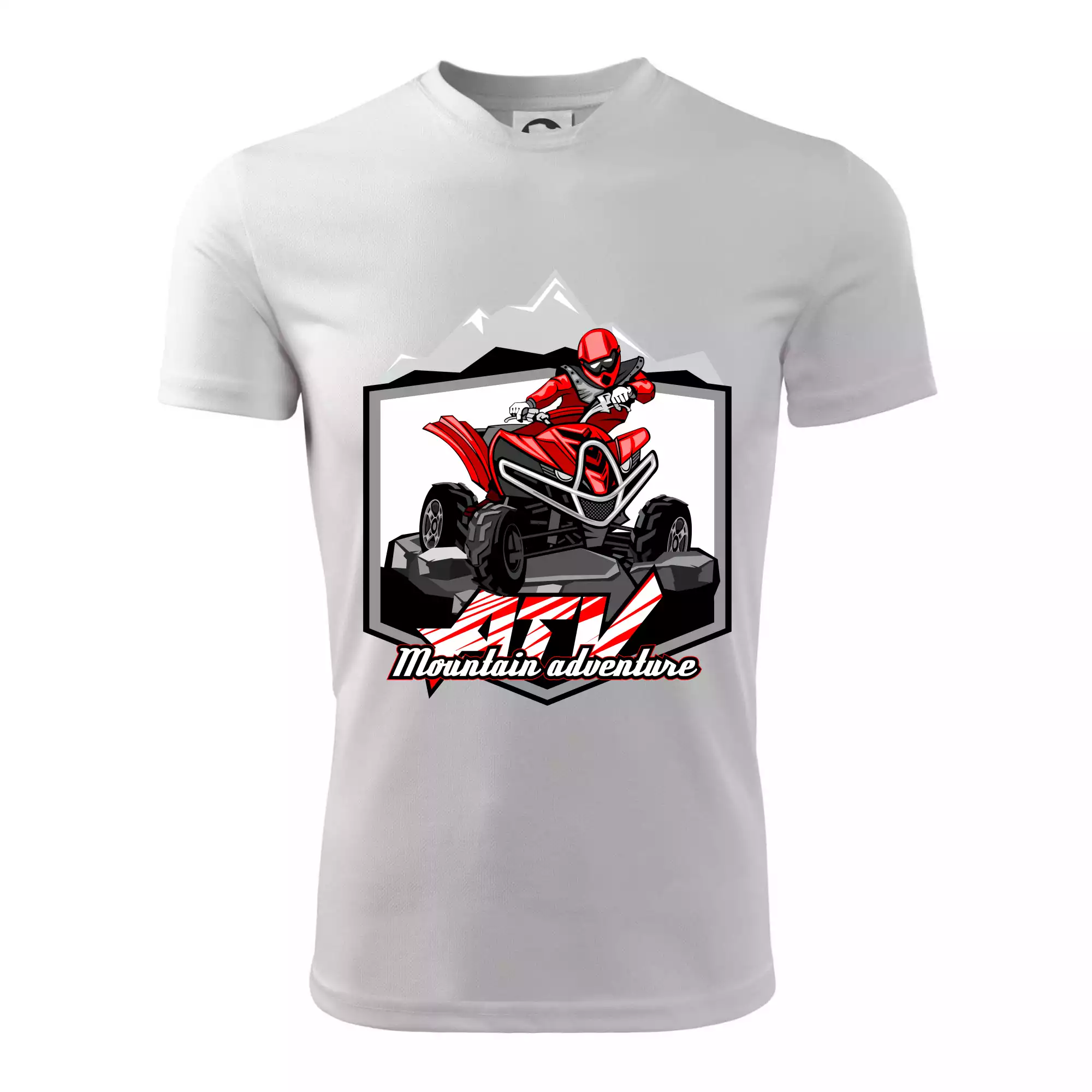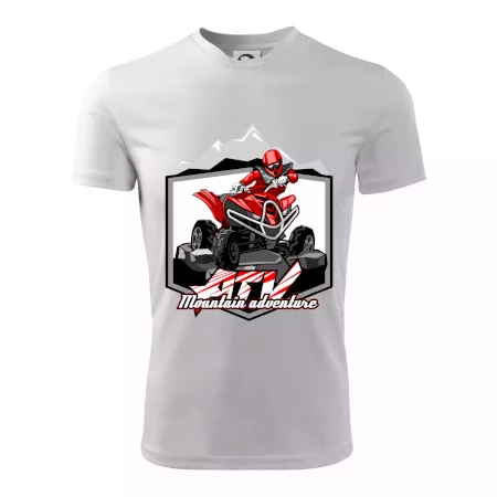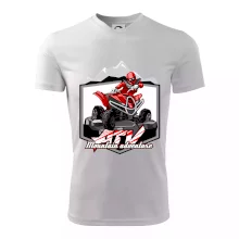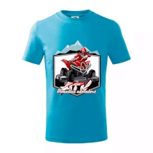 Triko pro motoristy, na kterém je červená čtyřkolka ATV a v pozadí hory. Motoristické triko kde je off road čtyřkolka musí mít doma každý motorista. Triko se čtyřkolkou je vhodný dárek pro motoristu, který má rád adrenalin. Čtyřkolka na triku je jako živá, prostě parádní auto.