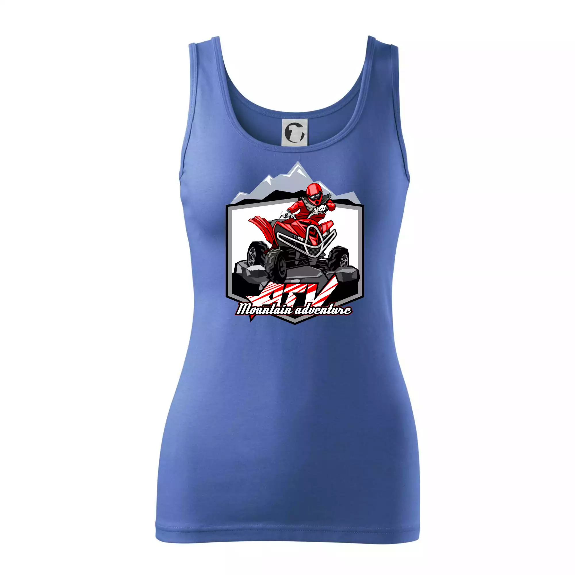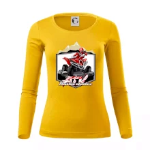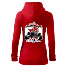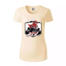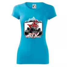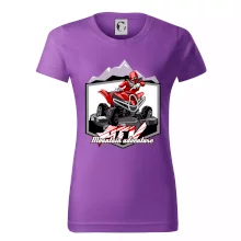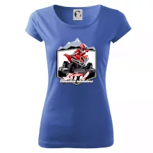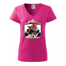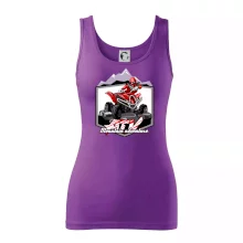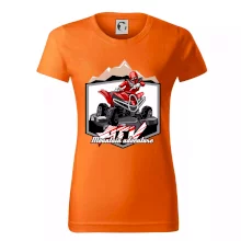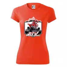 Triko pro motoristy, na kterém je červená čtyřkolka ATV a v pozadí hory. Motoristické triko kde je off road čtyřkolka musí mít doma každý motorista. Triko se čtyřkolkou je vhodný dárek pro motoristu, který má rád adrenalin. Čtyřkolka na triku je jako živá, prostě parádní auto.