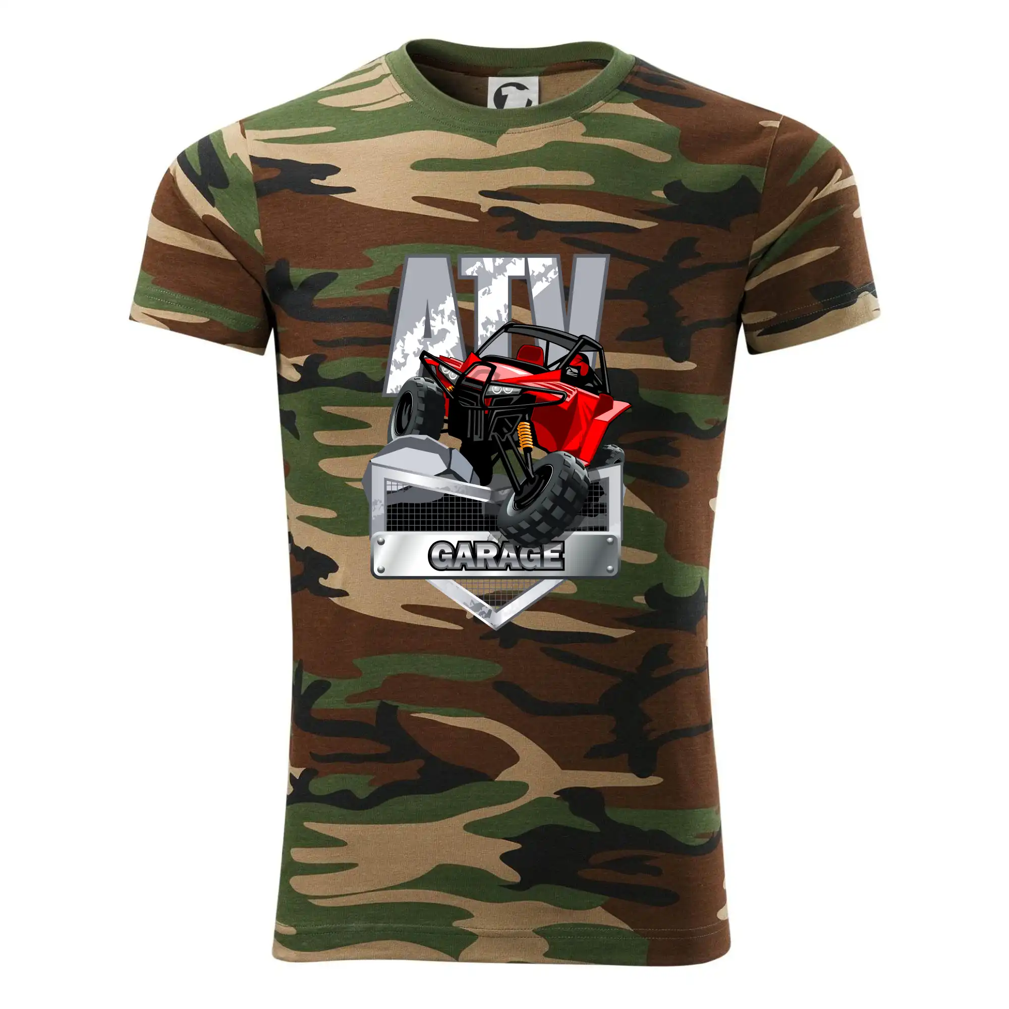 Triko pro motoristy, na kterém je červená čtyřkolka ATV. Motoristické triko se čtyřkolkou musí mít doma každý motorista. Triko s autem je vhodný dárek pro motoristu. Auto na triku je jako živé.