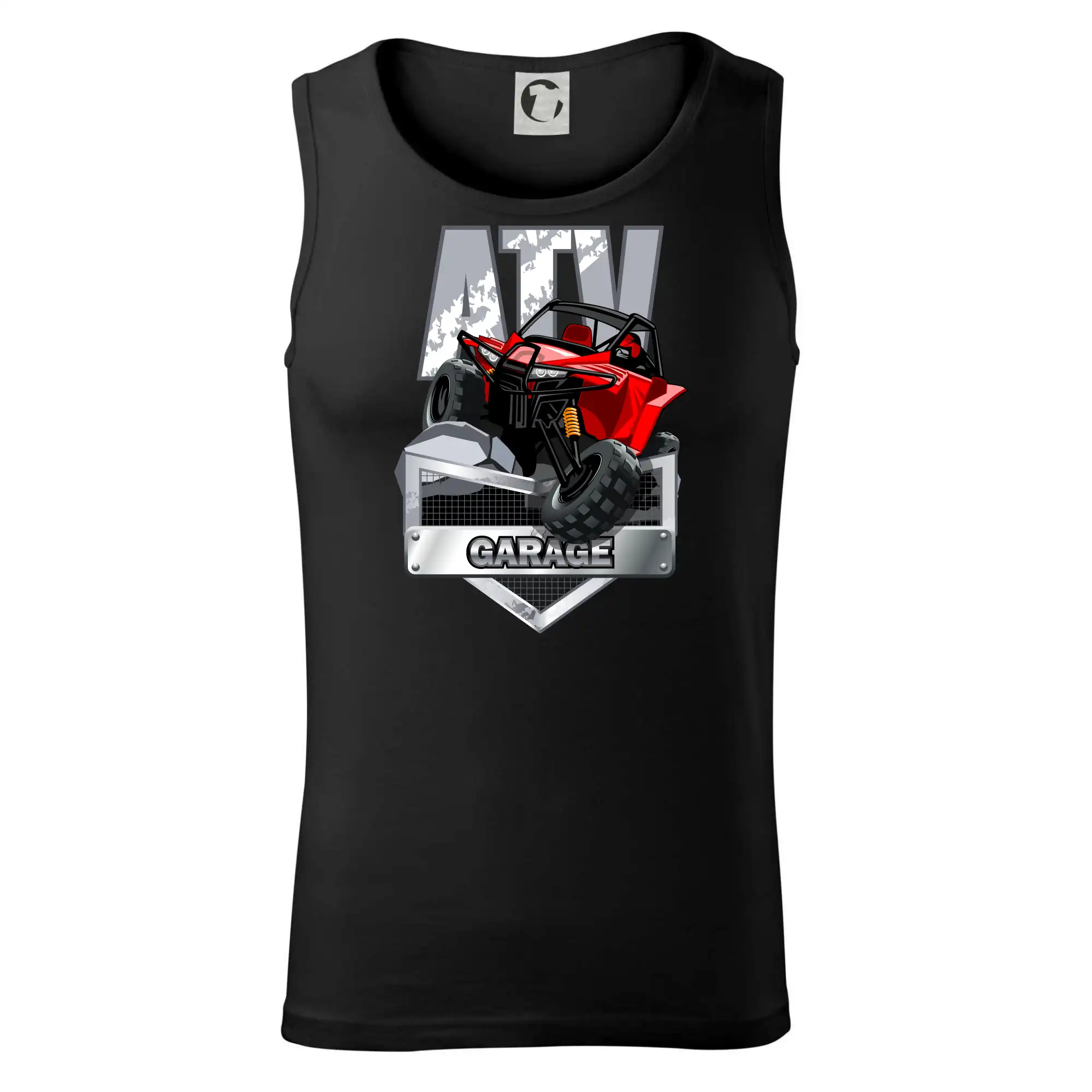 Triko pro motoristy, na kterém je červená čtyřkolka ATV. Motoristické triko se čtyřkolkou musí mít doma každý motorista. Triko s autem je vhodný dárek pro motoristu. Auto na triku je jako živé.