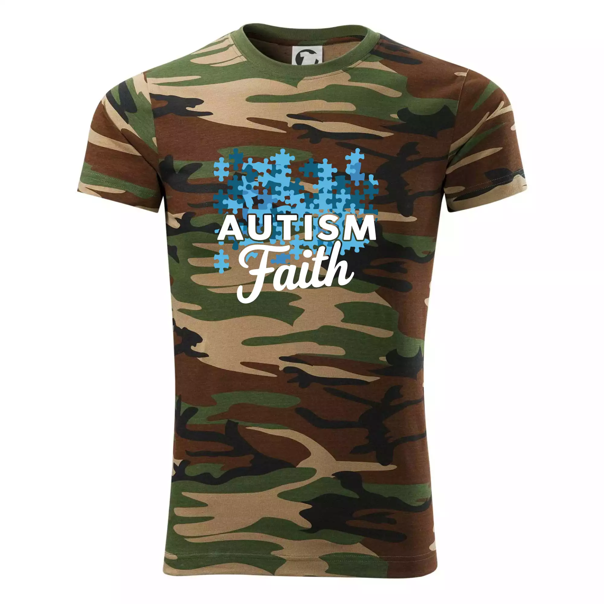 Tričko střední gramáže v barvách camouflage. Střih s bočními švy. Lem průkrčníku ze žebrového úpletu s přídavkem 5 % elastanu. Vnitřní část zadního průkrčníku začištěna páskou v barvě camouflage.