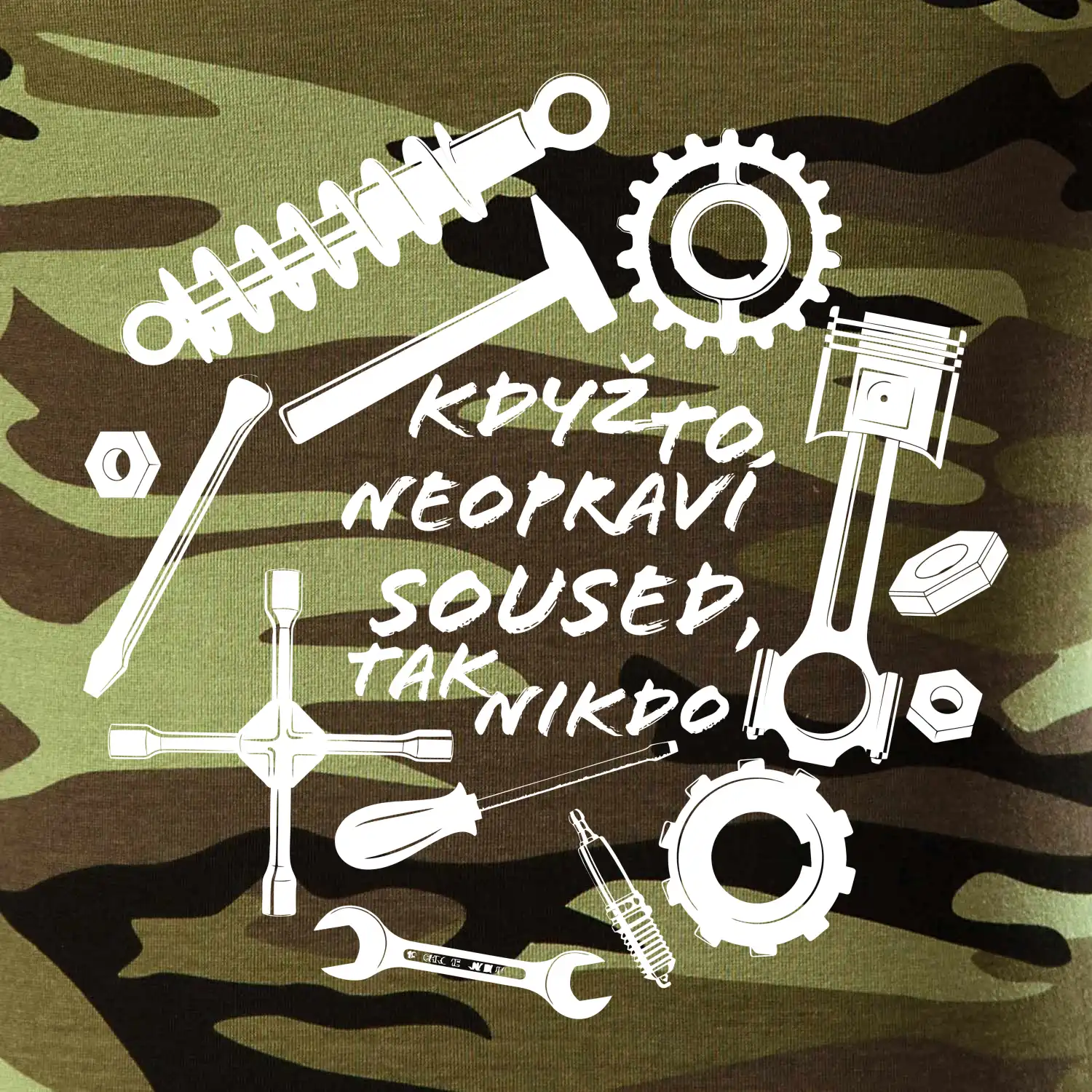 Tričko střední gramáže v barvách camouflage. Střih s bočními švy. Lem průkrčníku ze žebrového úpletu s přídavkem 5 % elastanu. Vnitřní část zadního průkrčníku začištěna páskou v barvě camouflage.