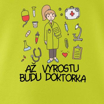 Dětské triko s nápisem "Až vyrostu, budu doktorka" je vhodný dárek pro dítě, které chce být lékař. Triko, na kterém je lékařka, lékárnička, injekce, mikroskop, náplast a další zdravotnické vybavení, ho určitě potěší!