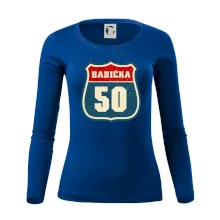 Nápaditý motiv silniční tabule – nese hrdé označení „Babička 50“ v originálním stylu