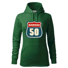 Nápaditý motiv silniční tabule – nese hrdé označení „Babička 50“ v originálním stylu