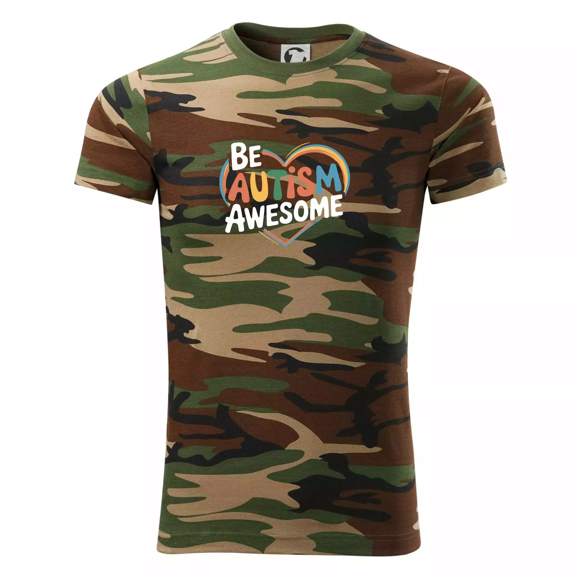 Tričko střední gramáže v barvách camouflage. Střih s bočními švy. Lem průkrčníku ze žebrového úpletu s přídavkem 5 % elastanu. Vnitřní část zadního průkrčníku začištěna páskou v barvě camouflage.