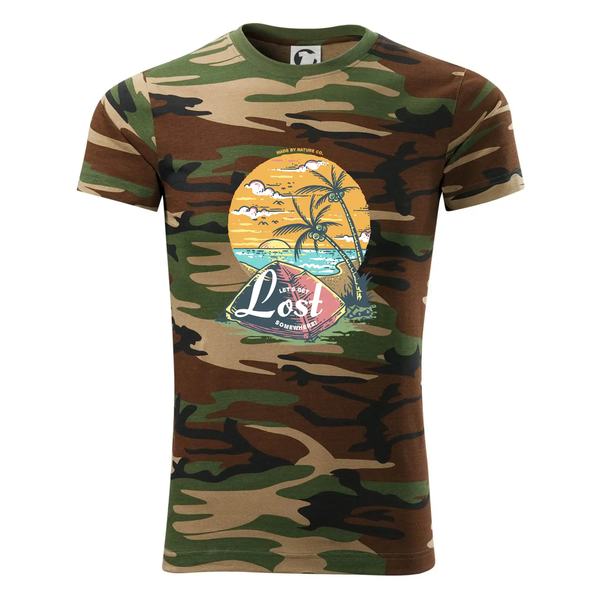 Tričko střední gramáže v barvách camouflage. Střih s bočními švy. Lem průkrčníku ze žebrového úpletu s přídavkem 5 % elastanu. Vnitřní část zadního průkrčníku začištěna páskou v barvě camouflage.