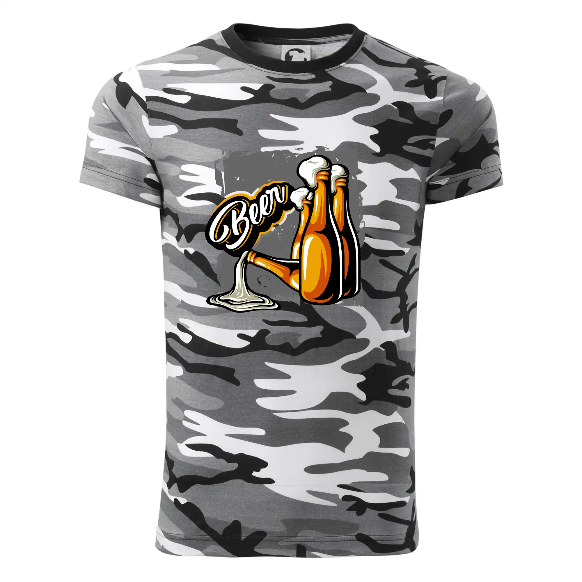 Tričko střední gramáže v barvách camouflage. Střih s bočními švy. Lem průkrčníku ze žebrového úpletu s přídavkem 5 % elastanu. Vnitřní část zadního průkrčníku začištěna páskou v barvě camouflage.
