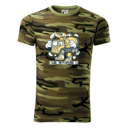 Tričko střední gramáže v barvách camouflage. Střih s bočními švy. Lem průkrčníku ze žebrového úpletu s přídavkem 5 % elastanu. Vnitřní část zadního průkrčníku začištěna páskou v barvě camouflage.