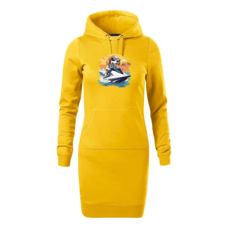Dámské mikinové šaty MALFINI Snap 419 jsou ideální volbou pro ženy, které hledají pohodlný a stylový kousek pro volný čas nebo každodenní nošení. Lehce vypasovaný střih s bočními švy podtrhuje ženskou siluetu, zatímco kapuce s podšívkou a stahovací šňůrkou dodává ležérní vzhled.