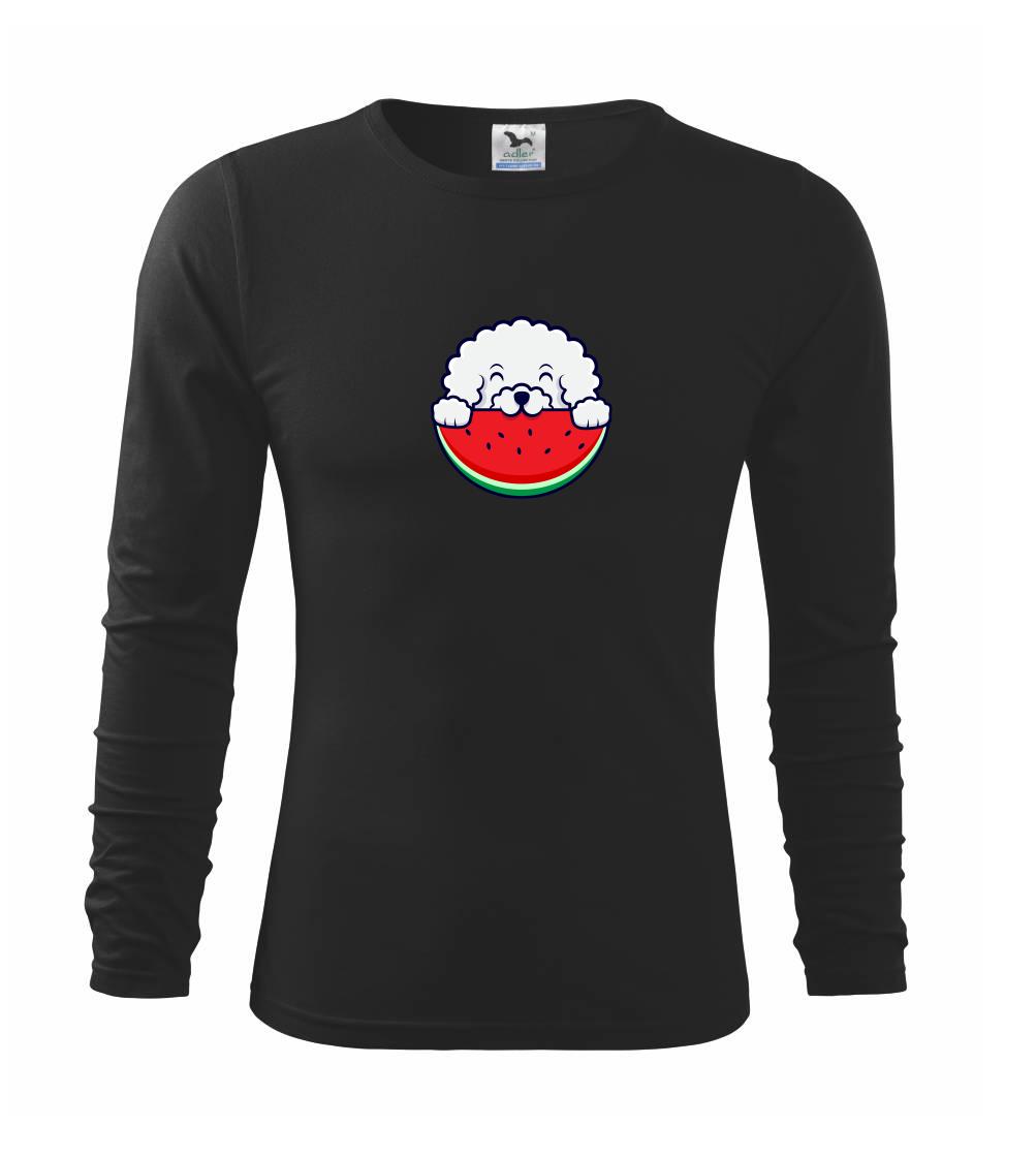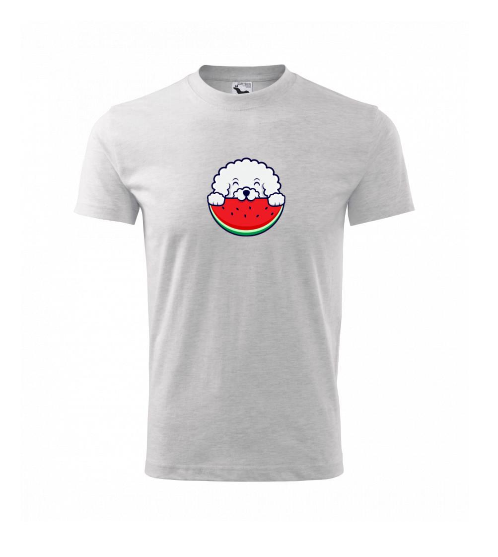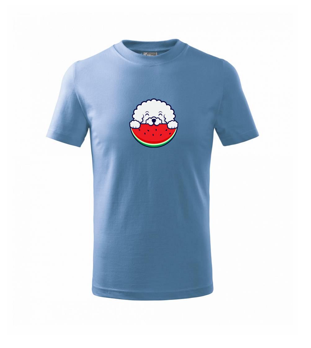 Triko s bišonkem a melounem jako skvělý dárek pro paničku bišonka. Bišonek na triku je esence roztomilosti. Krásný bílý malý pes společenské povahy je jeden z nejroztomilejších, které si můžete u nás pořídit.