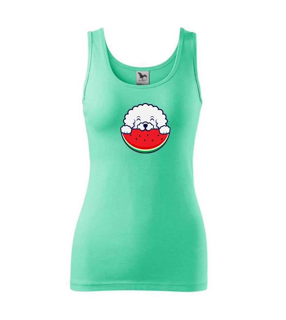Triko s bišonkem a melounem jako skvělý dárek pro paničku bišonka. Bišonek na triku je esence roztomilosti. Krásný bílý malý pes společenské povahy je jeden z nejroztomilejších, které si můžete u nás pořídit.