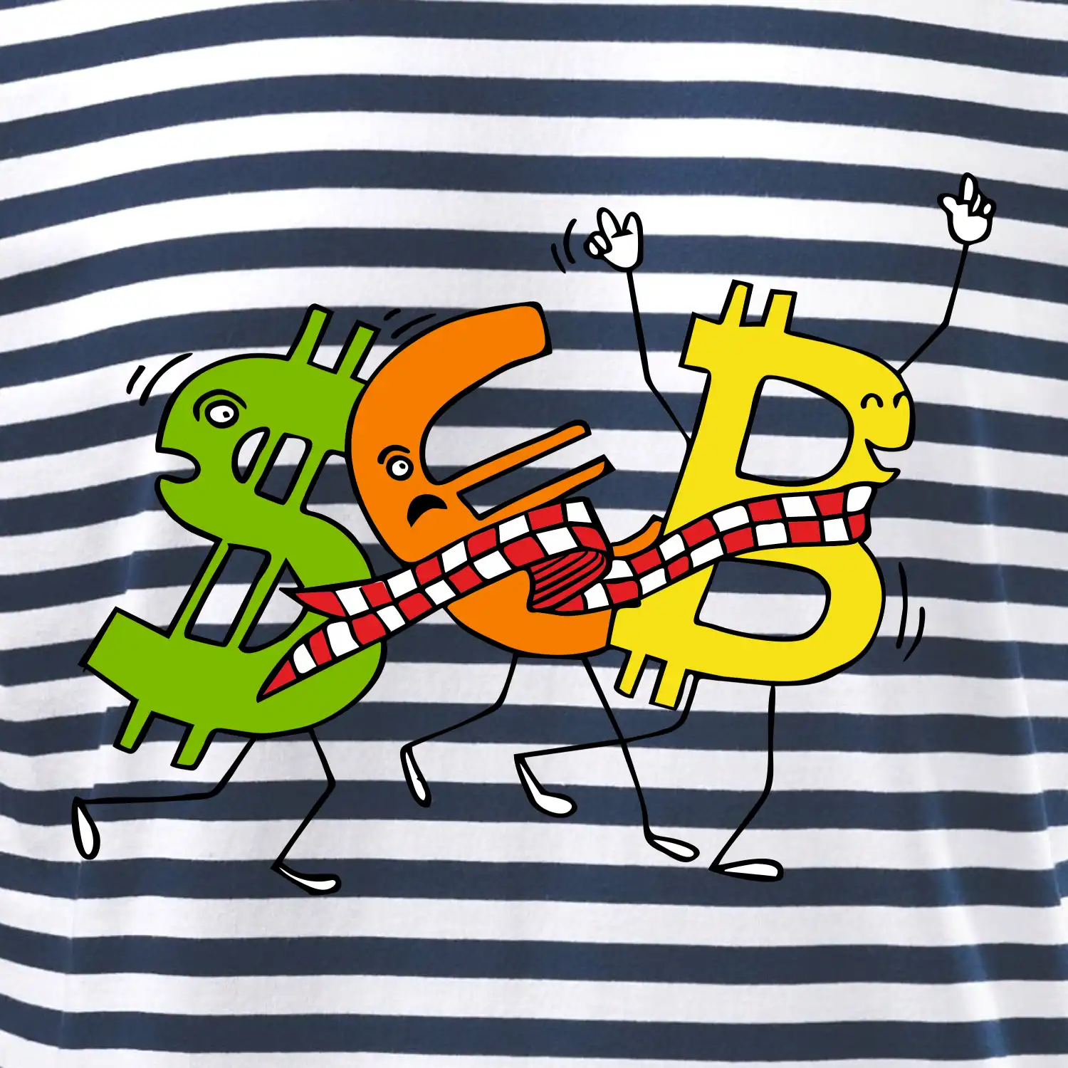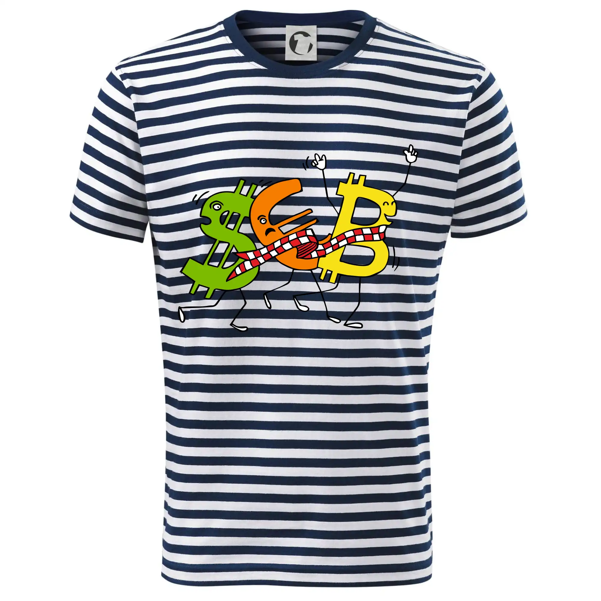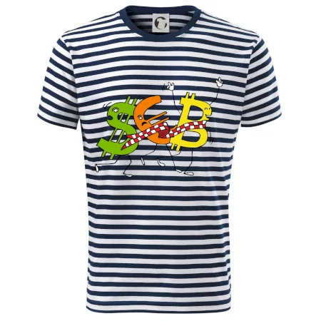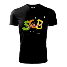 Měnové triko se symboly dolar, euro a bitcoin. Triko pro směnárníka nebo bankéře.