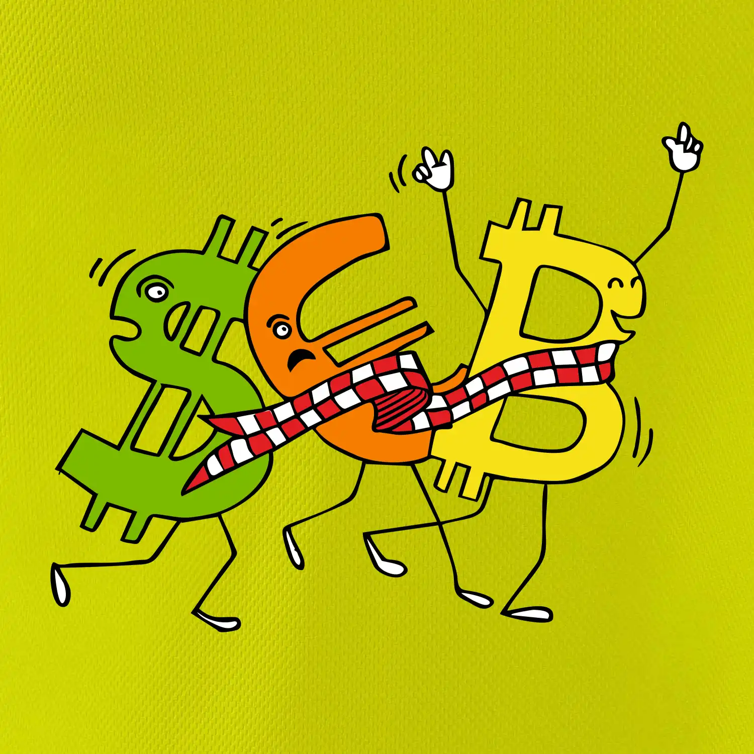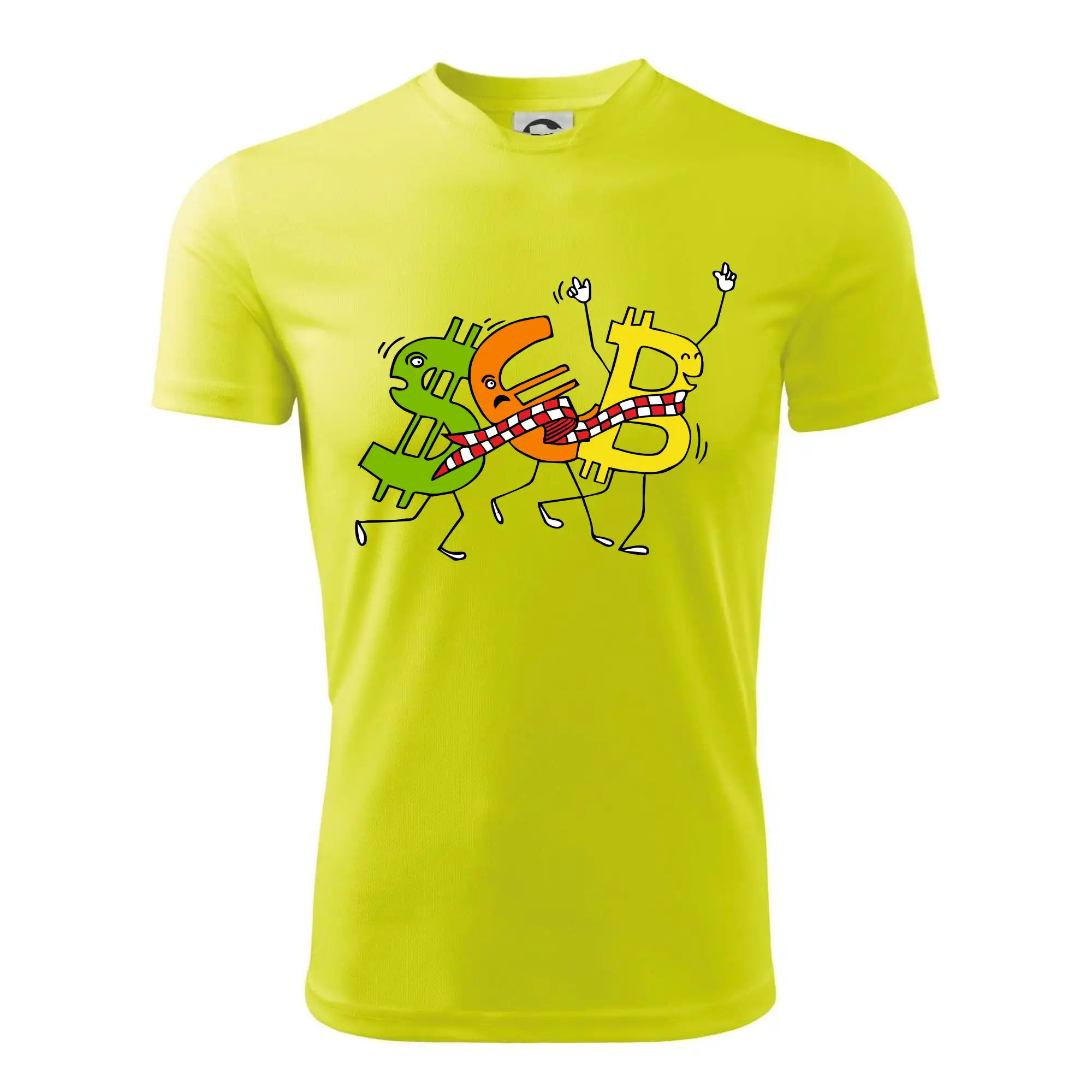Měnové triko se symboly dolar, euro a bitcoin. Triko pro směnárníka nebo bankéře.