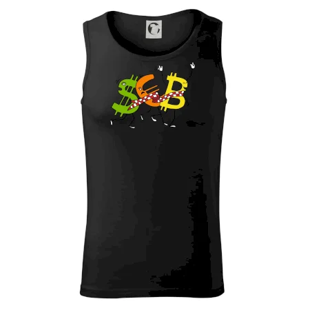 Měnové triko se symboly dolar, euro a bitcoin. Triko pro směnárníka nebo bankéře.