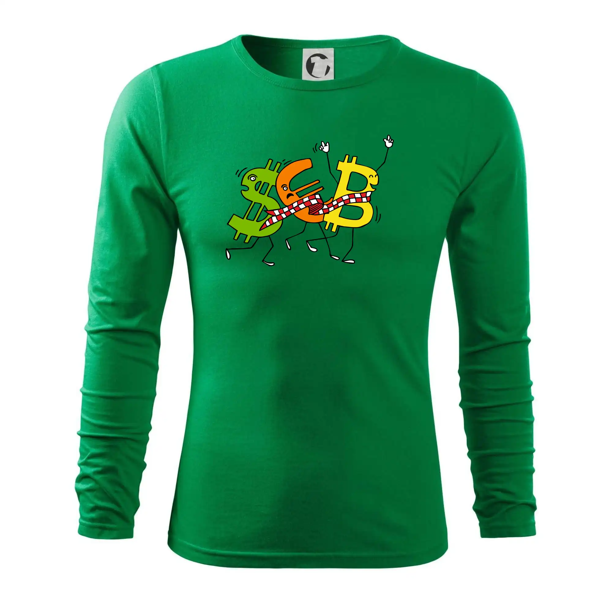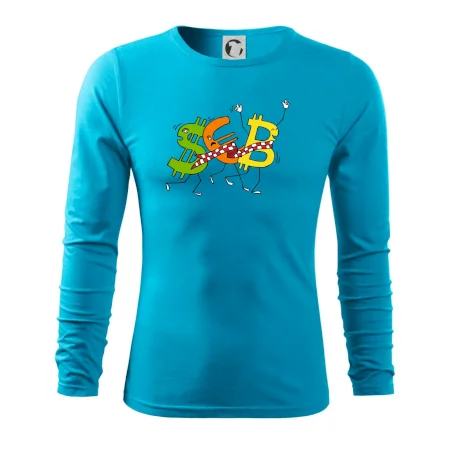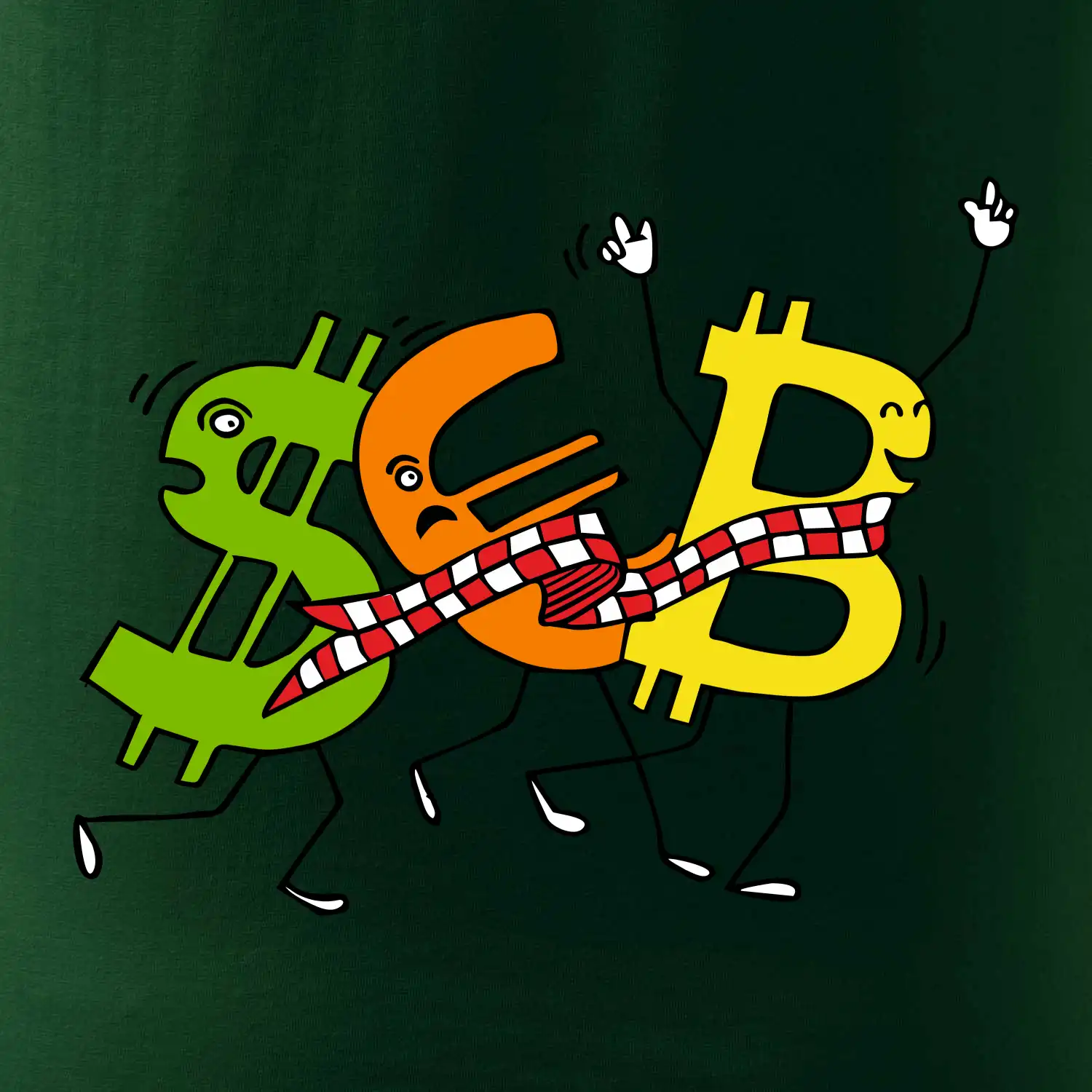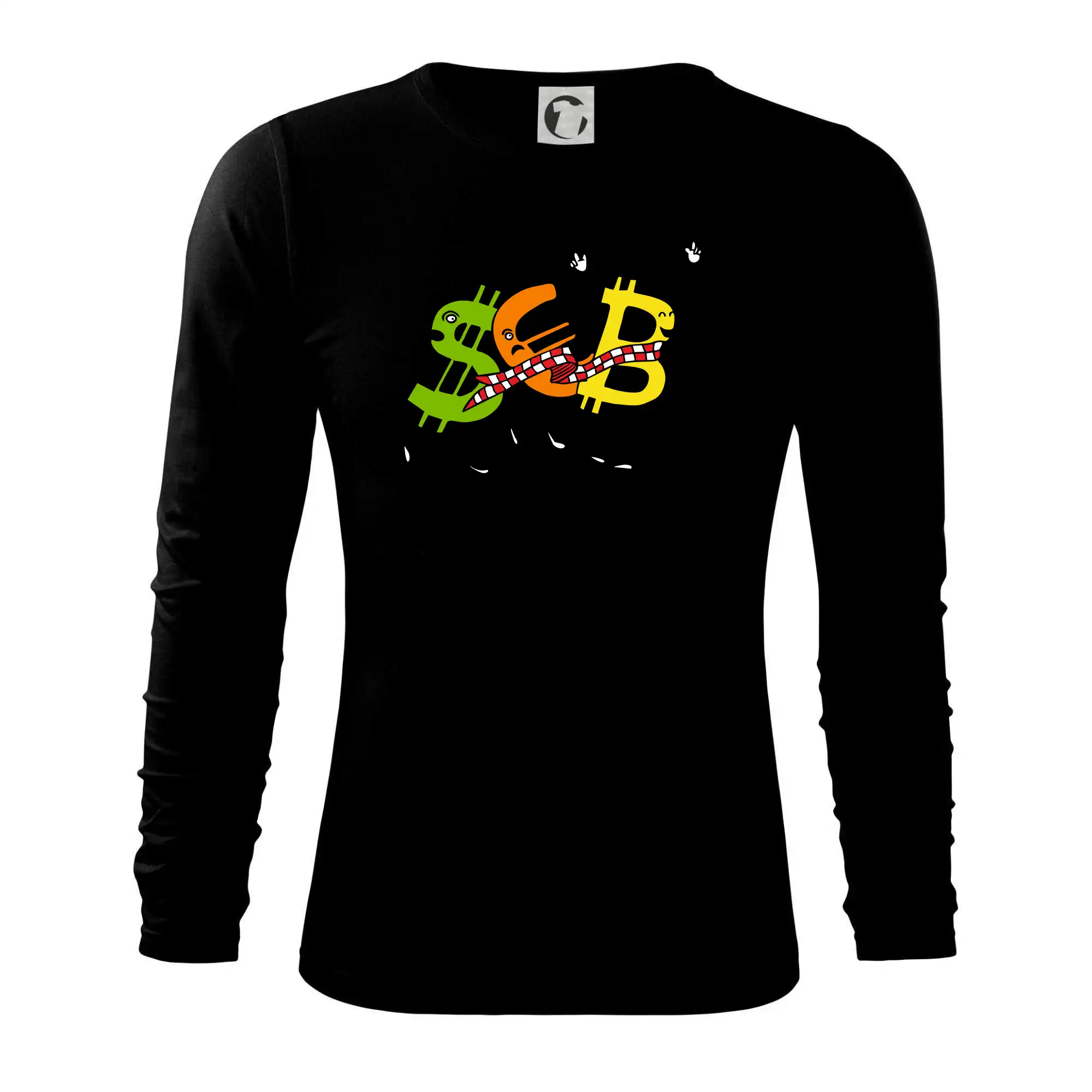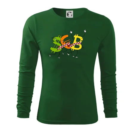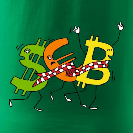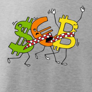 Měnové triko se symboly dolar, euro a bitcoin. Triko pro směnárníka nebo bankéře.