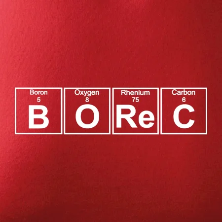 Triko pro borce, který má rád chemii. Z prvků periodické tabulky lze poskládat mnoho. Proč si tedy nevybrat ten správný prvek a na triko si nenatisknout třeba nápis BOReC. Trička a mikiny pro všechny borce. Triko s periodickou tabulkou jako vtipný dárek pro každého borce. Jsi borec? Miluješ chemii? Potom máme trička právě pro tebe!
