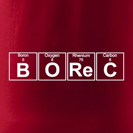 Triko pro borce, který má rád chemii. Z prvků periodické tabulky lze poskládat mnoho. Proč si tedy nevybrat ten správný prvek a na triko si nenatisknout třeba nápis BOReC. Trička a mikiny pro všechny borce. Triko s periodickou tabulkou jako vtipný dárek pro každého borce. Jsi borec? Miluješ chemii? Potom máme trička právě pro tebe!