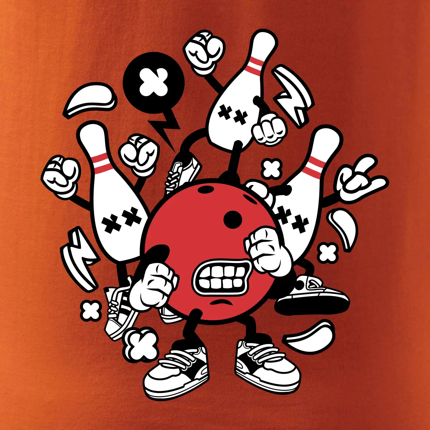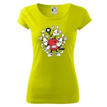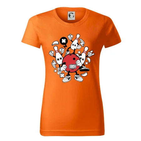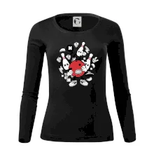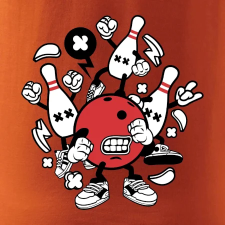 Triko pro hráče bowlingu, na kterém je bowlingová koule a kuželky. Bowlingové triko by měl mít každý bowlingový hráč. S bowlingovým trikem to bude samý strike, žádná kuželka neunikne!