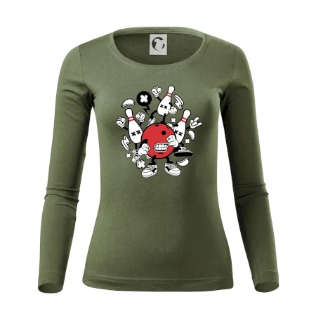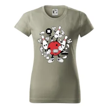 Triko pro hráče bowlingu, na kterém je bowlingová koule a kuželky. Bowlingové triko by měl mít každý bowlingový hráč. S bowlingovým trikem to bude samý strike, žádná kuželka neunikne!