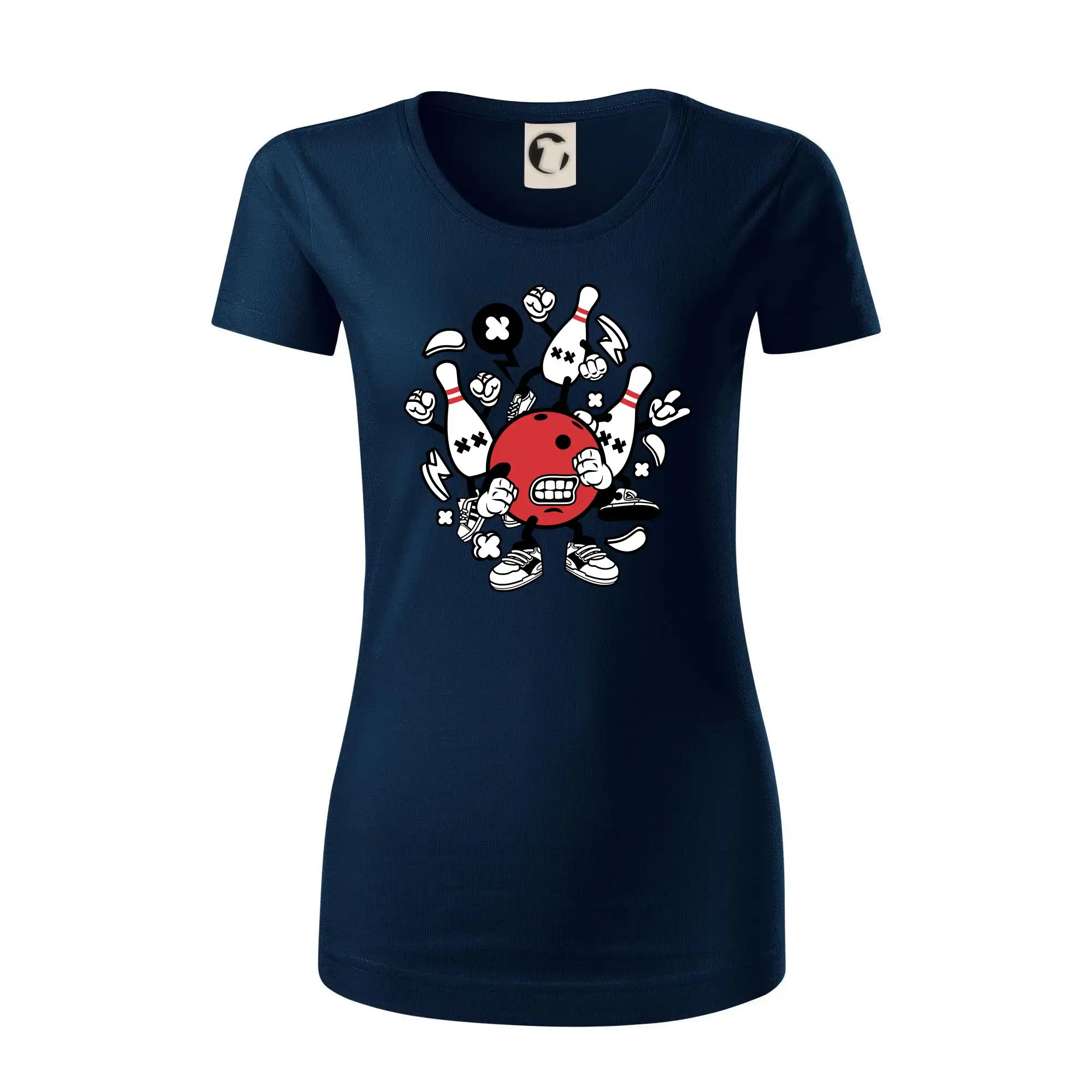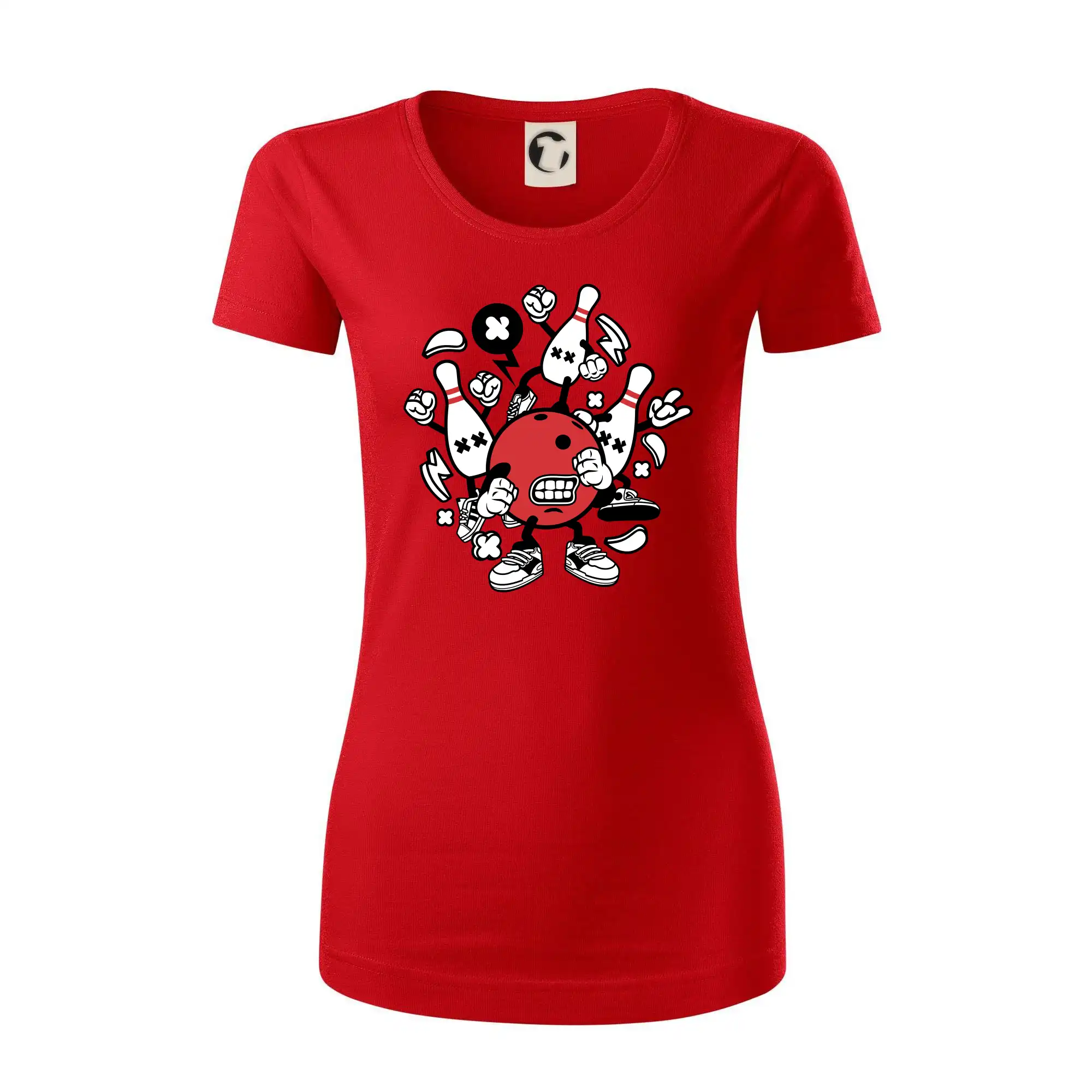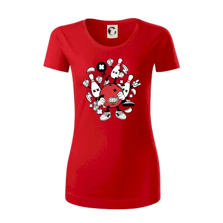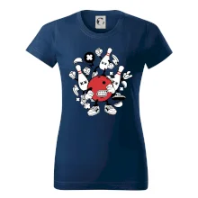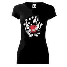 Triko pro hráče bowlingu, na kterém je bowlingová koule a kuželky. Bowlingové triko by měl mít každý bowlingový hráč. S bowlingovým trikem to bude samý strike, žádná kuželka neunikne!
