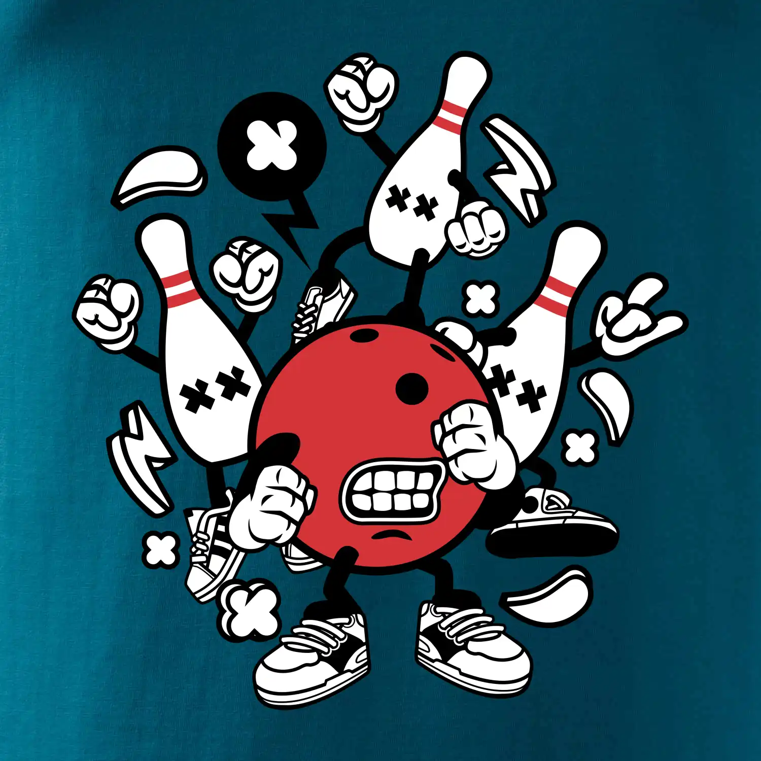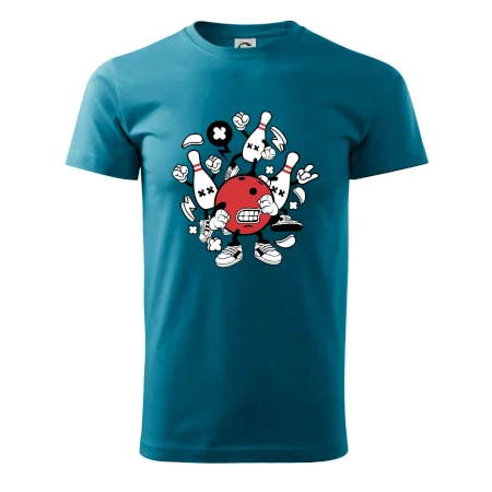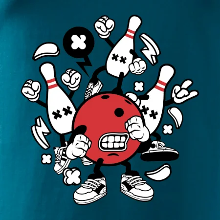 Triko pro hráče bowlingu, na kterém je bowlingová koule a kuželky. Bowlingové triko by měl mít každý bowlingový hráč. S bowlingovým trikem to bude samý strike, žádná kuželka neunikne!