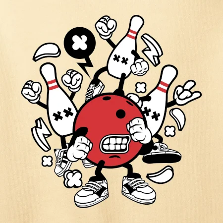 Triko pro hráče bowlingu, na kterém je bowlingová koule a kuželky. Bowlingové triko by měl mít každý bowlingový hráč. S bowlingovým trikem to bude samý strike, žádná kuželka neunikne!