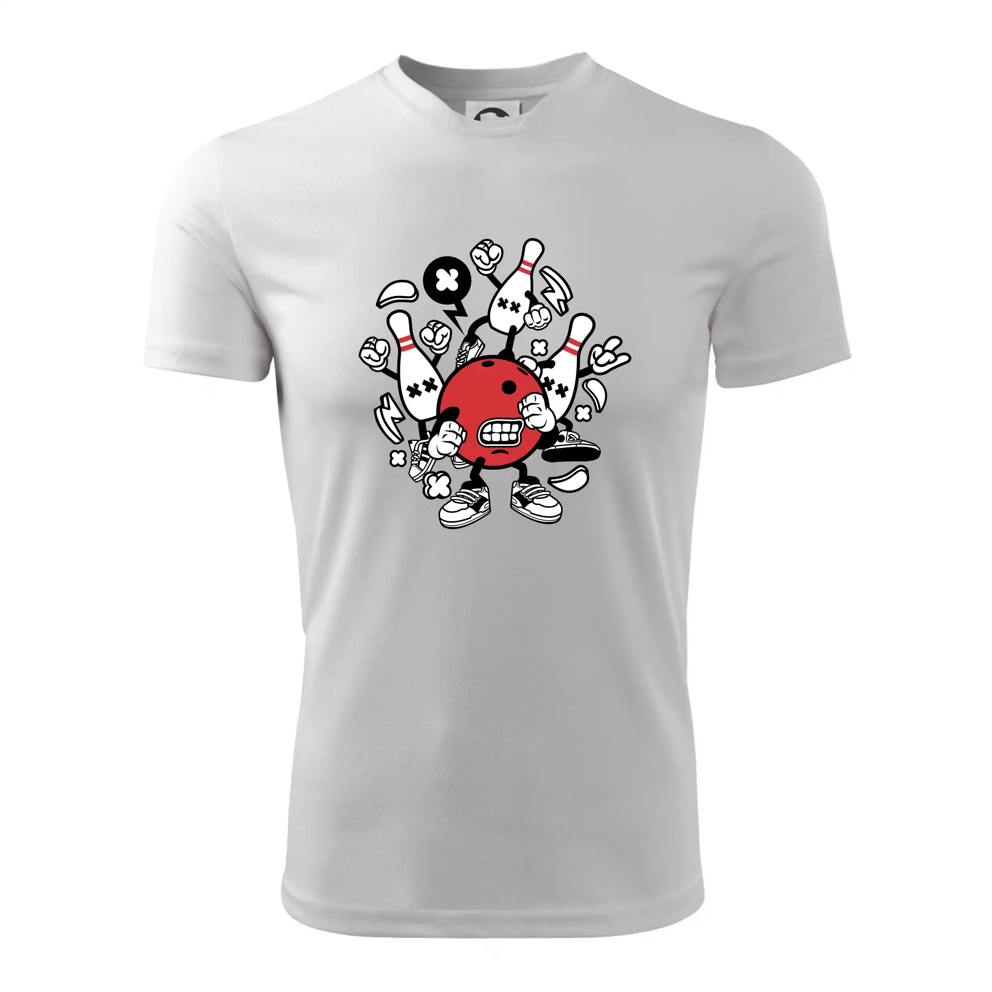 Triko pro hráče bowlingu, na kterém je bowlingová koule a kuželky. Bowlingové triko by měl mít každý bowlingový hráč. S bowlingovým trikem to bude samý strike, žádná kuželka neunikne!