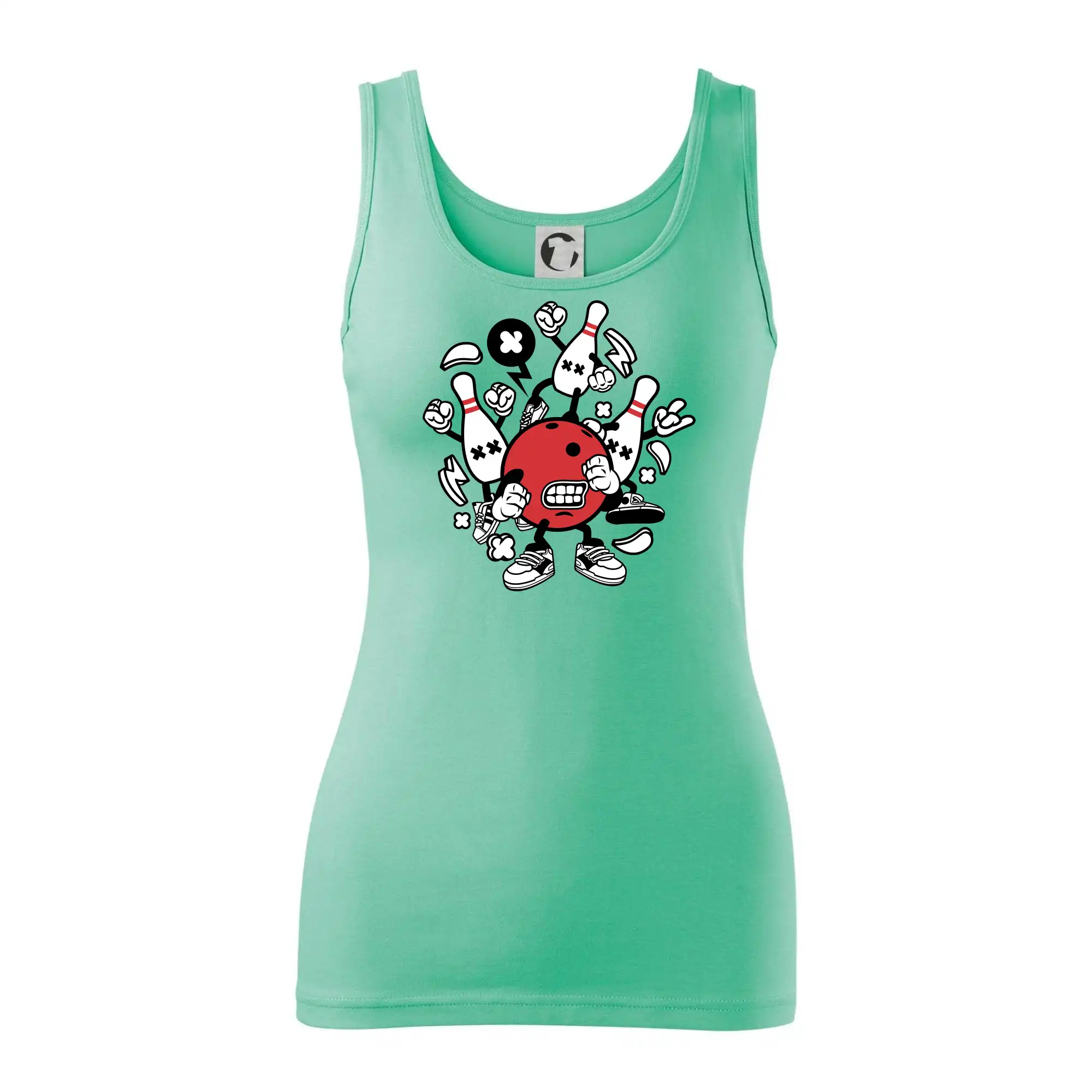 Triko pro hráče bowlingu, na kterém je bowlingová koule a kuželky. Bowlingové triko by měl mít každý bowlingový hráč. S bowlingovým trikem to bude samý strike, žádná kuželka neunikne!