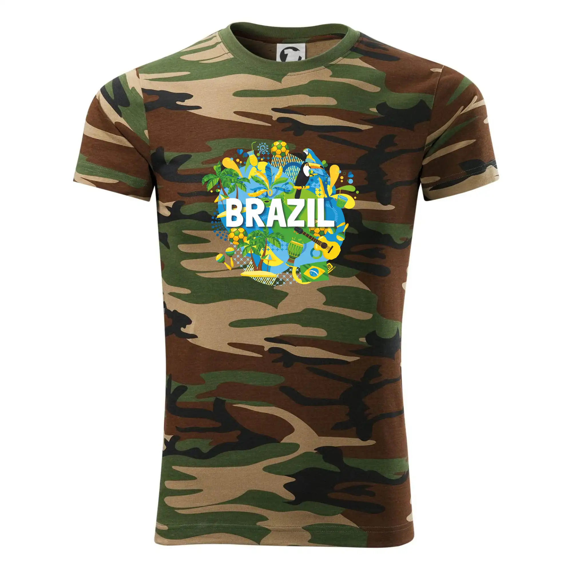 Tričko střední gramáže v barvách camouflage. Střih s bočními švy. Lem průkrčníku ze žebrového úpletu s přídavkem 5 % elastanu. Vnitřní část zadního průkrčníku začištěna páskou v barvě camouflage.