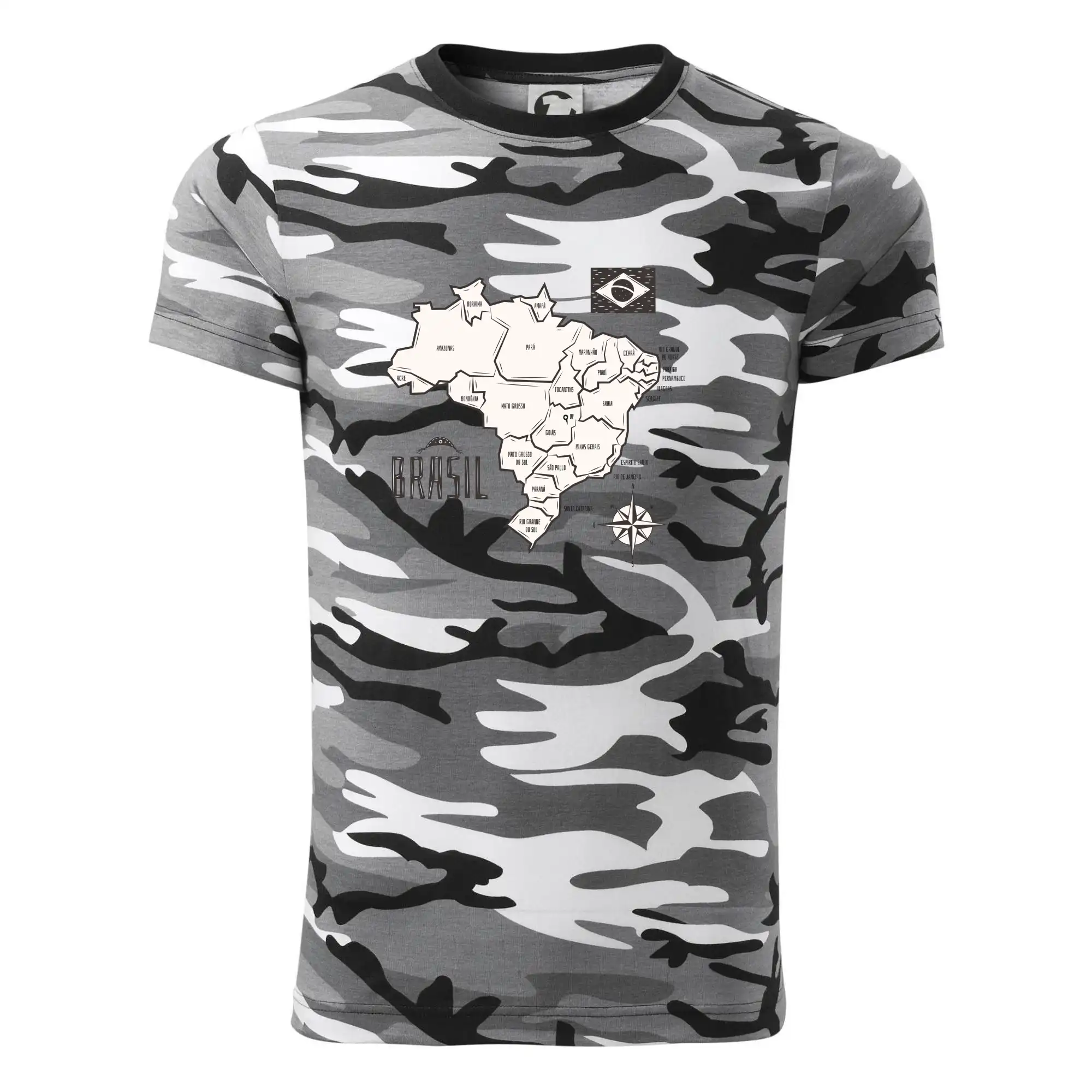 Tričko střední gramáže v barvách camouflage. Střih s bočními švy. Lem průkrčníku ze žebrového úpletu s přídavkem 5 % elastanu. Vnitřní část zadního průkrčníku začištěna páskou v barvě camouflage.