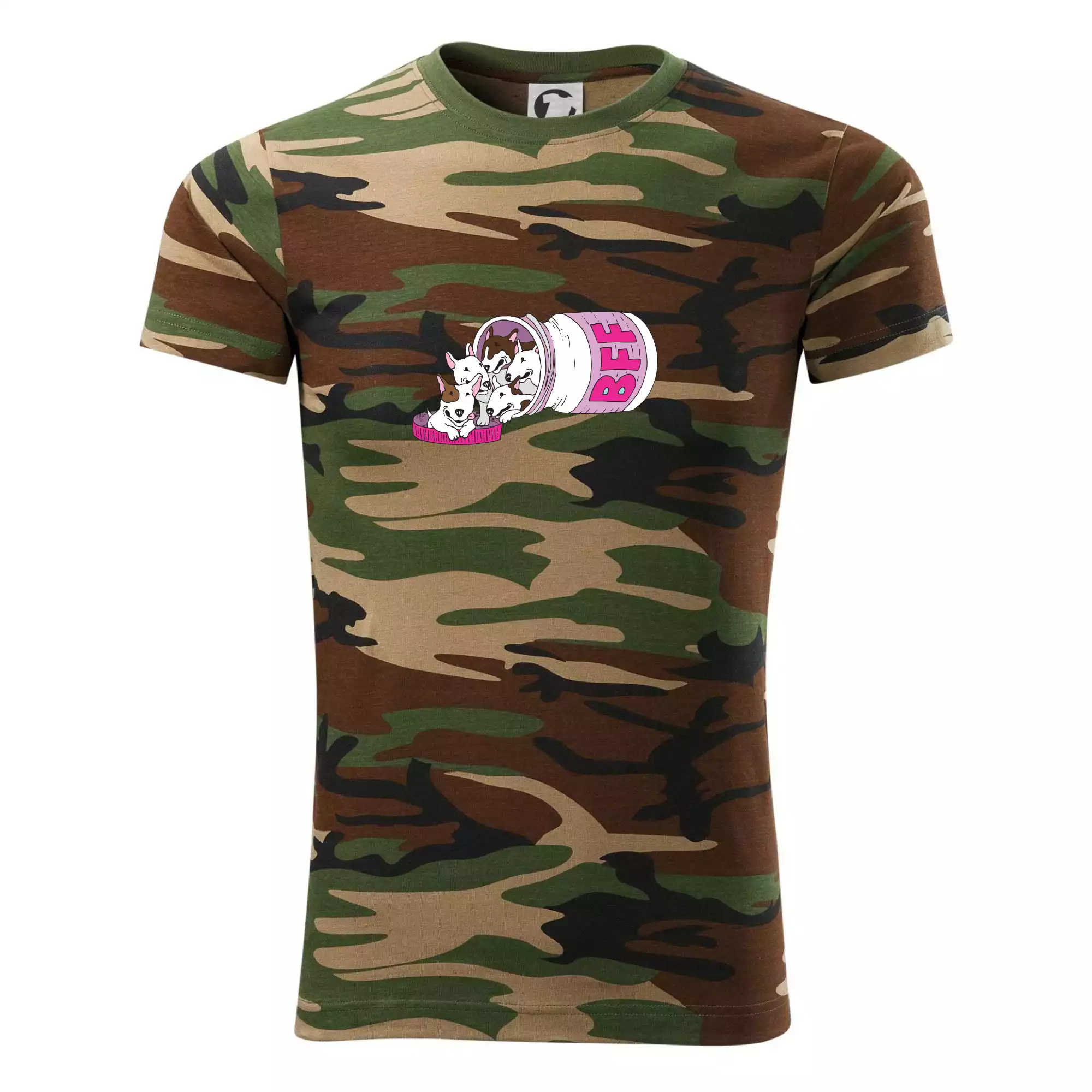 Tričko střední gramáže v barvách camouflage. Střih s bočními švy. Lem průkrčníku ze žebrového úpletu s přídavkem 5 % elastanu. Vnitřní část zadního průkrčníku začištěna páskou v barvě camouflage.