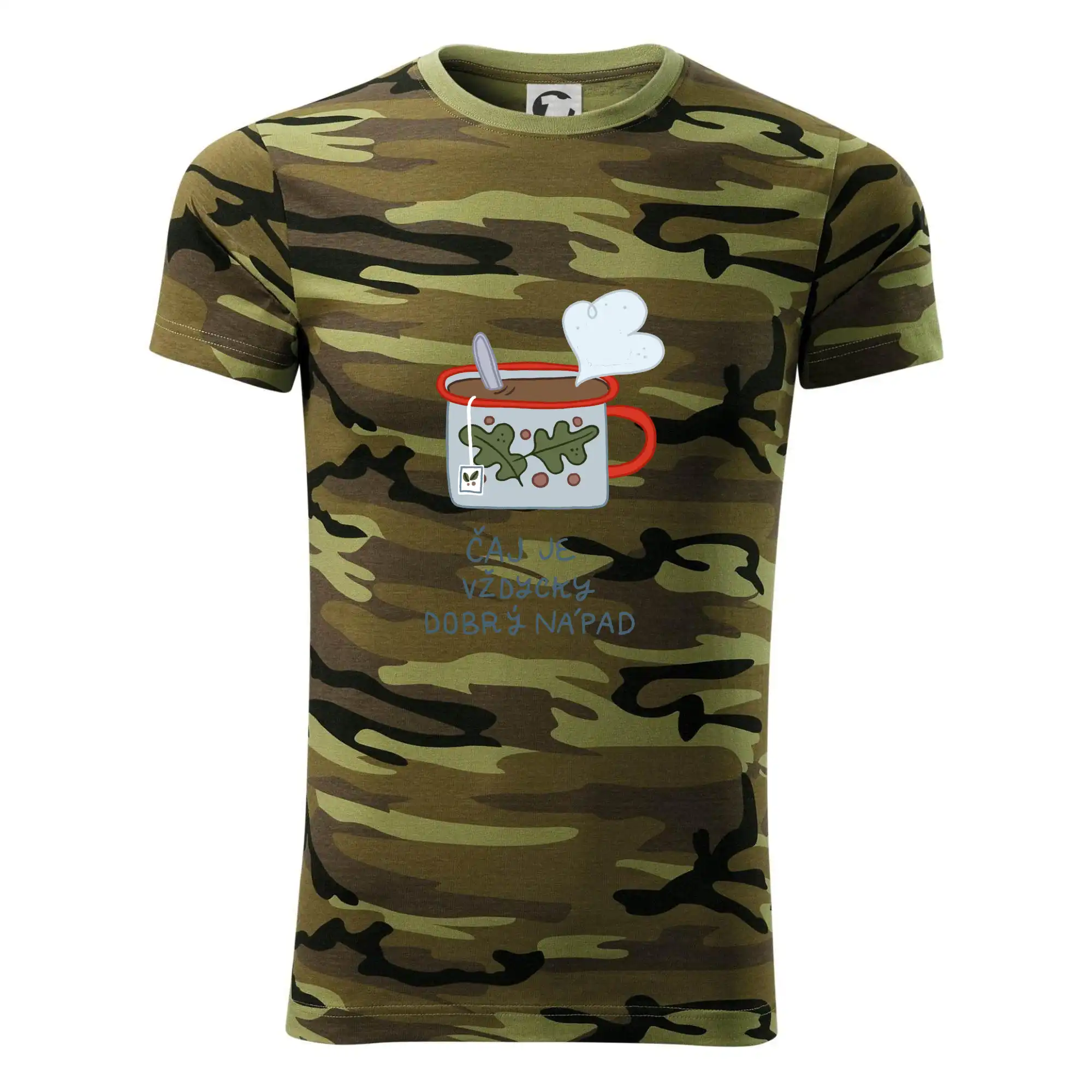 Tričko střední gramáže v barvách camouflage. Střih s bočními švy. Lem průkrčníku ze žebrového úpletu s přídavkem 5 % elastanu. Vnitřní část zadního průkrčníku začištěna páskou v barvě camouflage.