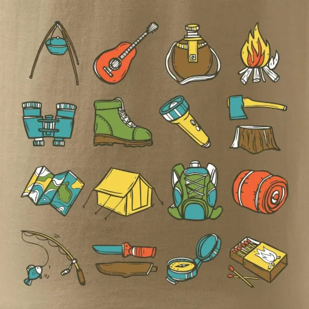 Tohle triko pro kempaře ti může posloužit jako seznam věcí, které si máš vzít na čundr. Odškrtávej si: kytara, ešus, čutora, dalekohled, baterka, sekyrka, spacák, stan, mapa, sirky, kompas, nůž, zápalky ... máš všechno? Pak můžeš vyrazit a prožít pořádné dobrodružství při kempování v lese. Dárek pro kempaře potěší všechny milovníky toulání se v přírodě.
