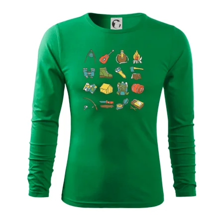 Tohle triko pro kempaře ti může posloužit jako seznam věcí, které si máš vzít na čundr. Odškrtávej si: kytara, ešus, čutora, dalekohled, baterka, sekyrka, spacák, stan, mapa, sirky, kompas, nůž, zápalky ... máš všechno? Pak můžeš vyrazit a prožít pořádné dobrodružství při kempování v lese. Dárek pro kempaře potěší všechny milovníky toulání se v přírodě.