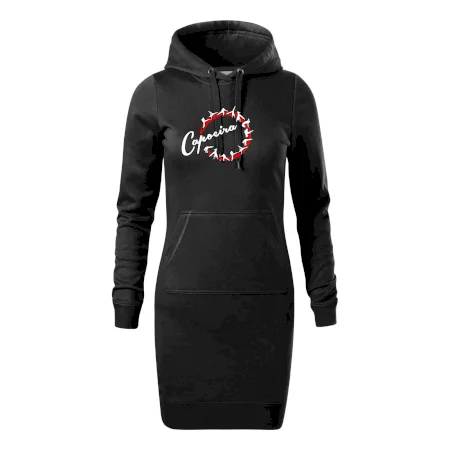 Dámské mikinové šaty MALFINI Snap 419 jsou ideální volbou pro ženy, které hledají pohodlný a stylový kousek pro volný čas nebo každodenní nošení. Lehce vypasovaný střih s bočními švy podtrhuje ženskou siluetu, zatímco kapuce s podšívkou a stahovací šňůrkou dodává ležérní vzhled.