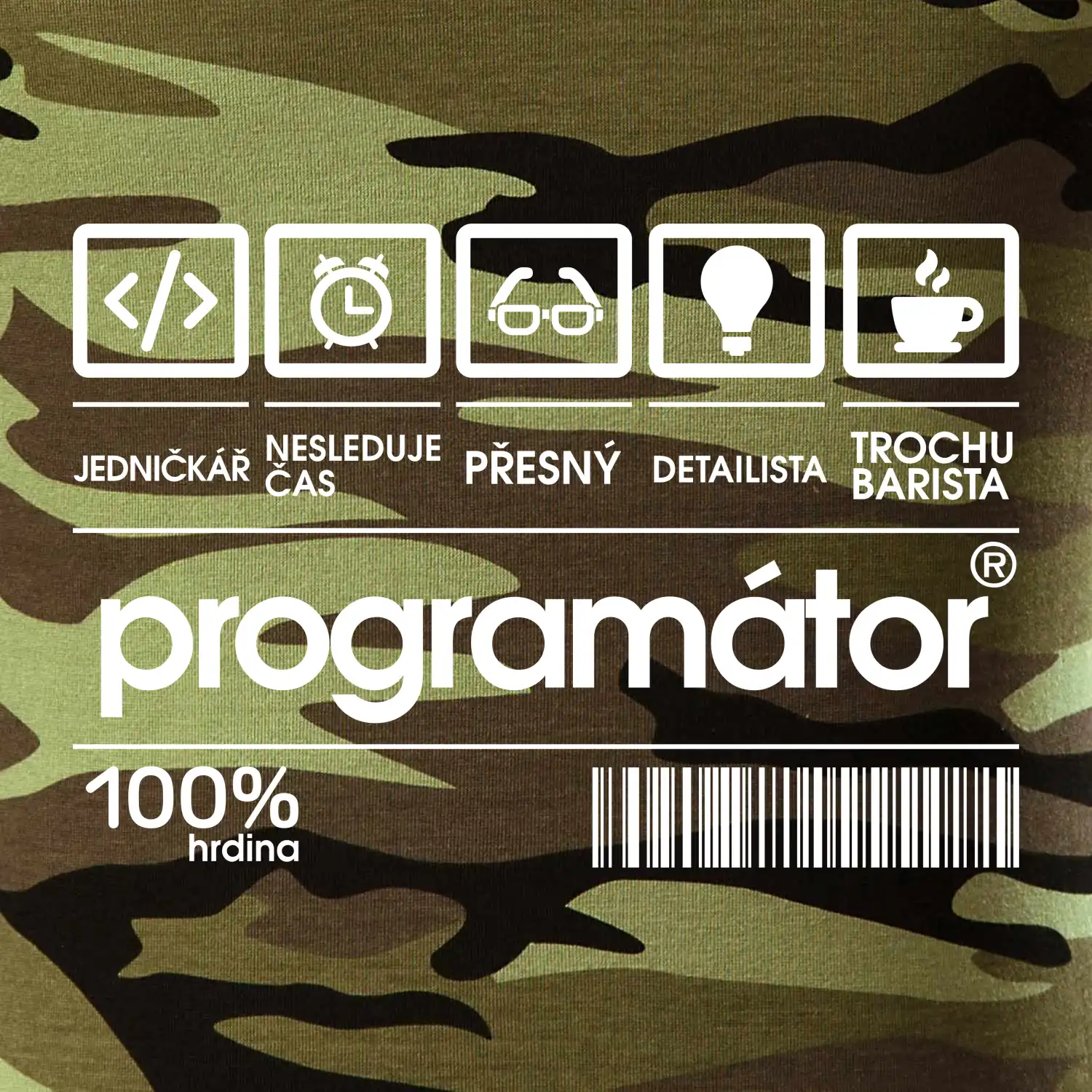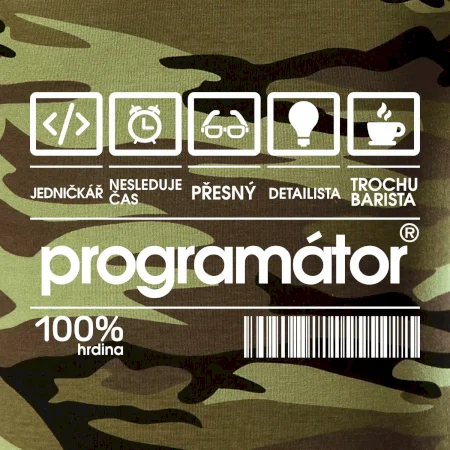 Tričko střední gramáže v barvách camouflage. Střih s bočními švy. Lem průkrčníku ze žebrového úpletu s přídavkem 5 % elastanu. Vnitřní část zadního průkrčníku začištěna páskou v barvě camouflage.