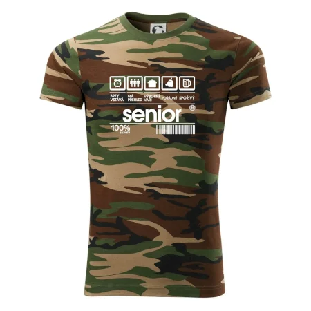 Tričko střední gramáže v barvách camouflage. Střih s bočními švy. Lem průkrčníku ze žebrového úpletu s přídavkem 5 % elastanu. Vnitřní část zadního průkrčníku začištěna páskou v barvě camouflage.