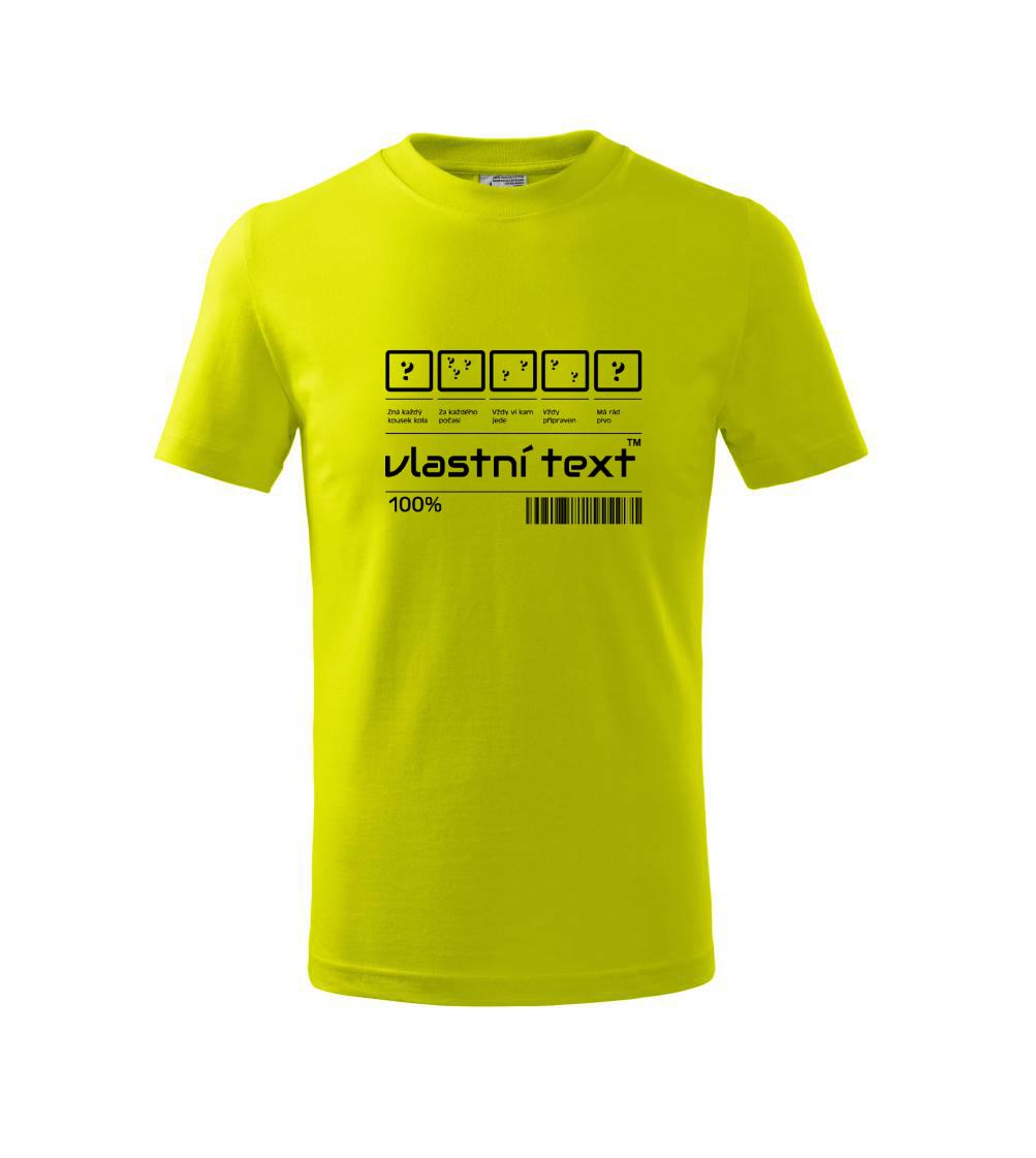 Do poznámky k objednávce nám napiš co chceš mít místo nápisu "vlastní text" a my doplníme ikonky, texty a budeš moct darovat naprosto originální triko. Tričko s originálním čárovým kódem pro každého. Čárový kód na přání!
