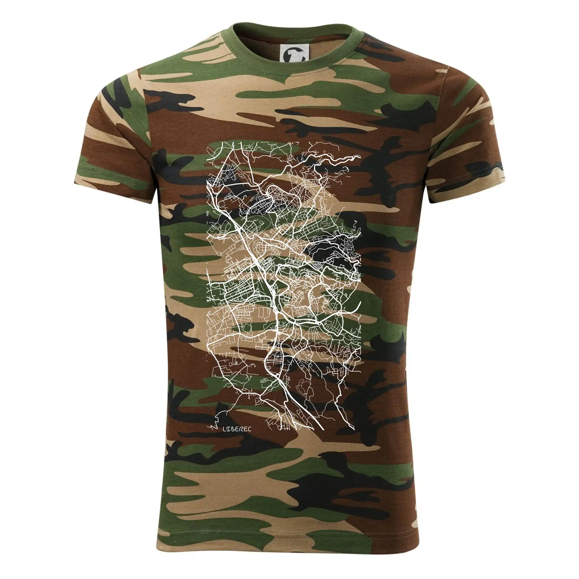 Tričko střední gramáže v barvách camouflage. Střih s bočními švy. Lem průkrčníku ze žebrového úpletu s přídavkem 5 % elastanu. Vnitřní část zadního průkrčníku začištěna páskou v barvě camouflage.