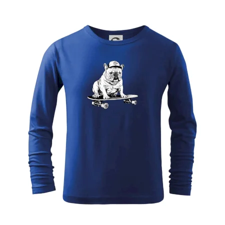 Černobílý buldok na skateboardu
