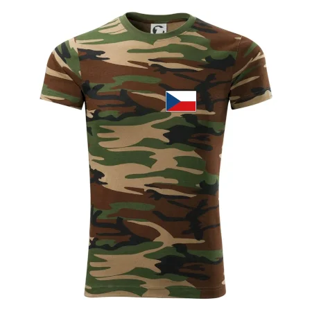 Tričko střední gramáže v barvách camouflage. Střih s bočními švy. Lem průkrčníku ze žebrového úpletu s přídavkem 5 % elastanu. Vnitřní část zadního průkrčníku začištěna páskou v barvě camouflage.