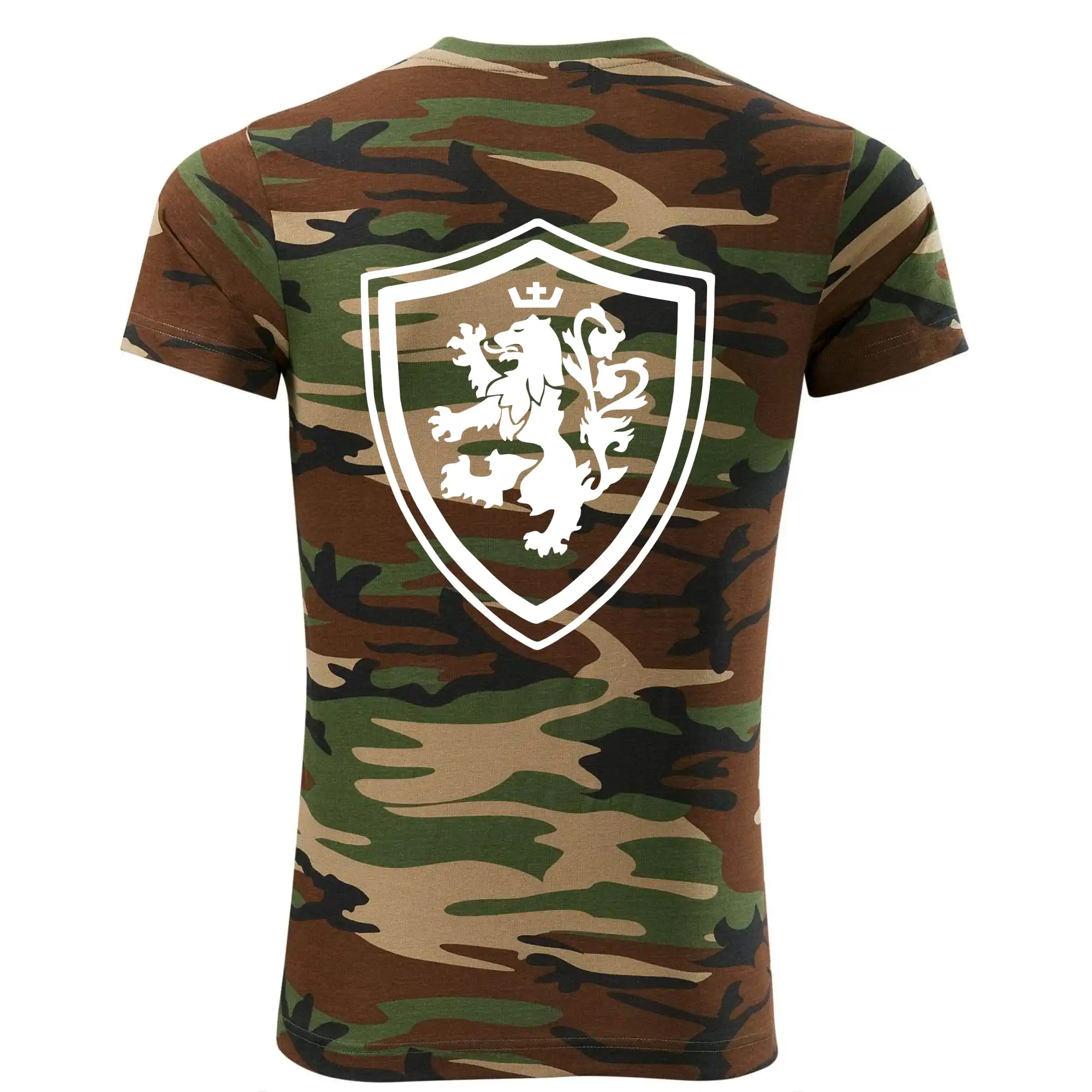 Tričko střední gramáže v barvách camouflage. Střih s bočními švy. Lem průkrčníku ze žebrového úpletu s přídavkem 5 % elastanu. Vnitřní část zadního průkrčníku začištěna páskou v barvě camouflage.