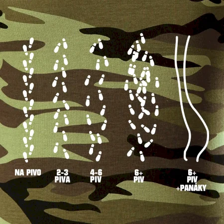 Tričko střední gramáže v barvách camouflage. Střih s bočními švy. Lem průkrčníku ze žebrového úpletu s přídavkem 5 % elastanu. Vnitřní část zadního průkrčníku začištěna páskou v barvě camouflage.