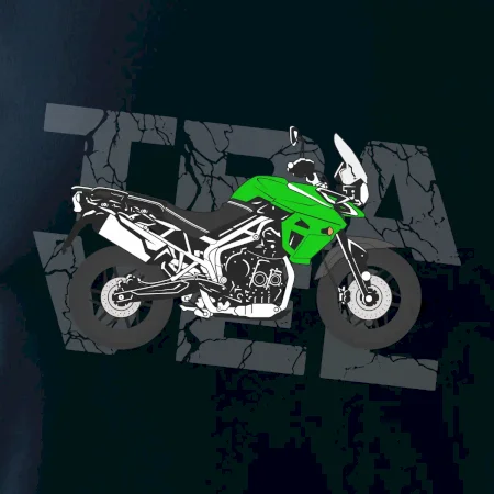 Triko pro motorkáře, na kterém je zelená cestovní enduro motorka. Motorkářské triko, kde je cestovní motorka, musí mít doma každý vášnivý motorkář. Triko s motorkou je vhodný dárek pro motorkáře.